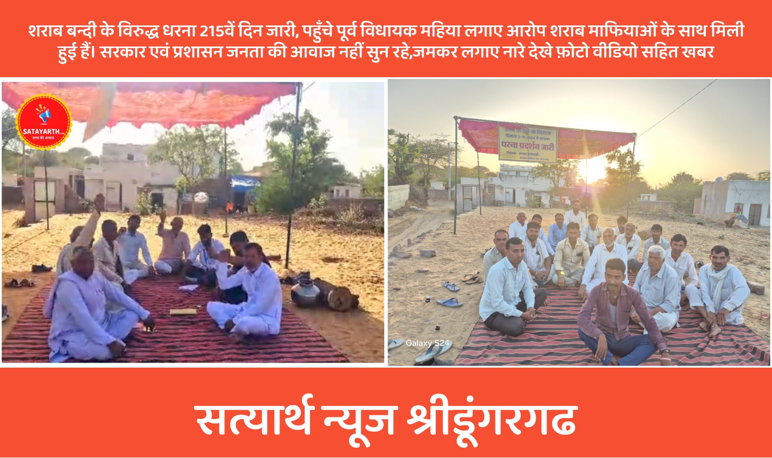 क्षेत्र के गांव धीरदेसर चोटियान में शराब ठेका बन्द करने की मांग को लेकर आज 215वें दिन ग्रामीणों का धरना जारी रहा। आज धरना स्थल पर पूर्व विधायक गिरधारीलाल महिया पहुंचे पूर्व विधायक माहिया ने आरोप लगाते हुए कहा कि सरकार व प्रशासन शराब माफियाओं के साथ मिला हुआ है। तभी ये हठधर्मी सरकार एवं प्रशासन जनता की आवाज ही नहीं सुन रहे है। महिया ने कहा कि आमजन 215दिनों से अपने सामाजिक ताने बाने को बचाने एवं भावी पीढ़ी को नशावृति से बचाने हेतु गांव में शराब ठेका बन्द करने के लिए लम्बे समय से शान्ति पूर्वक आन्दोलन कर रहे है। सरकार एवं प्रशासन को जिम्मेदारी पूर्वक शीघ्र आमजन की मांग माननी चाहिए। एडवोकेट श्याम सुंदर आर्य ने कहा कि हम शान्ति पूर्वक लम्बे समय से गांव में शराब ठेका बन्द करने के लिए संघर्ष कर रहे है। लम्बे संघर्ष के उपरांत भी सरकार एवं प्रशासन हमारी मांग पर ध्यान नहीं दे रहे है। गांव के युवा एवं आमजन आक्रोशित हो रहे। शीघ्र मांग नहीं मानी गई तो उग्र आंदोलन का निर्णय लेने को मजबूर होना पड़ेगा। जिसकी सम्पूर्ण जिम्मेदारी प्रशासन की होगी। इस दौरान धरनास्थल पर स्थानीय प्रशासन व जिला प्रशासन पर आरोप लगाते हुए धरनार्थियों ने जमकर नारे लगाए आज धरनास्थल पर केशराराम चोटिया आदूराम,भरत,सहीराम चोटिया परमेश्वरलाल चोटिया ओमप्रकाश चोटिया मदन,सीताराम,बीरबलराम कानाराम मोटाराम सांसी,बलबीर चोटिया,किशन चोटिया उपस्थित थे।
