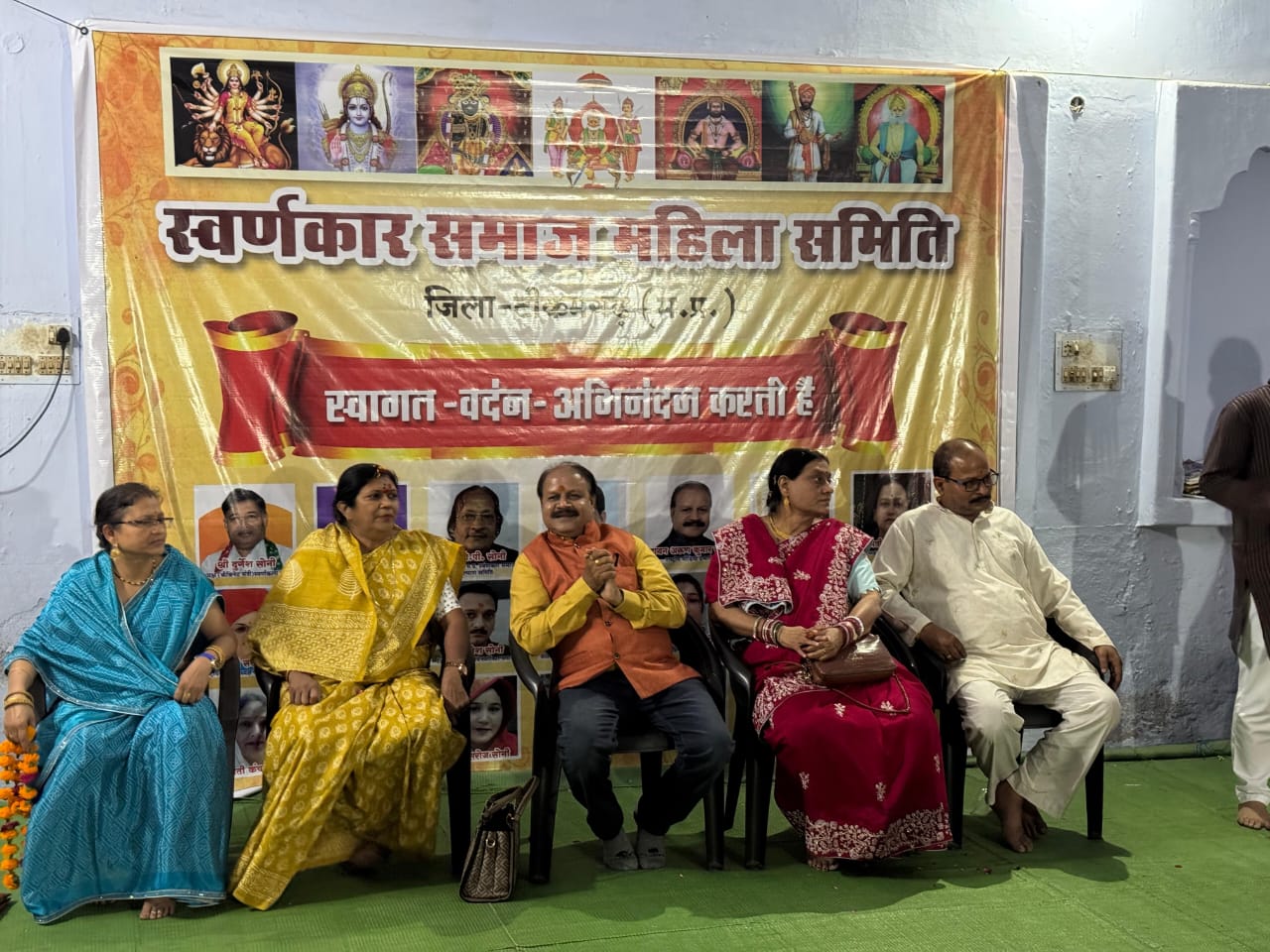 स्वर्णकार समाज की अति सक्रिय एवं भारतीय जनता पार्टी महिला नगर अध्यक्ष संध्या प्रमोद सोनी को जैसे ही विदित हुआ की विदिशा निवासी अखिल भारतीय स्वर्णकार महासभा के राष्ट्रीय मीडिया प्रभारी एवं लायंस क्लब विदिशा अध्यक्ष लायन अरुण कुमार सोनी एवं श्रीमती लायन जयंती सोनी टीकमगढ़ प्रवास पर आ रहे हैं ,तो आपने स्वर्णकार समाज महिला समिति से विचार विमर्श कर राघव प्रसन्न मंदिर में सम्मान समारोह का आयोजन किया। लायन अरुण कुमार सोनी एवं श्रीमती लायन जयंती सोनी के कार्यक्रम में पहुंचते ही सर्वप्रथम शाल ,श्रीफल, पुष्प माला एवं उपहार के साथ आपका स्वागत, वंदन ,अभिनंदन एवं जिला अध्यक्ष भाजपा सरोज यादव का भी कार्यक्रम में पहुंचते ही शाल, श्रीफल ,पुष्पमाला एवं उपहार से स्वागत ,वंदन ,अभिनंदन, संध्या सोनी नगर अध्यक्ष भाजपा टीकमगढ़, एडवोकेट श्रीमती इंदिरा सोनी संभागीय अध्यक्ष अखिल भारतीय स्वर्णकार महासभा, पार्षद श्रीमती रानी सोनी, श्रीमती माया सोनी श्रीमती मधु सोनी, व्यापारी प्रमोद सोनी,स्वर्णकार समाज अध्यक्ष टीकमगढ़ भाई दिनेश सोनी, स्वर्णकार समाज उपाध्यक्ष टीकमगढ़