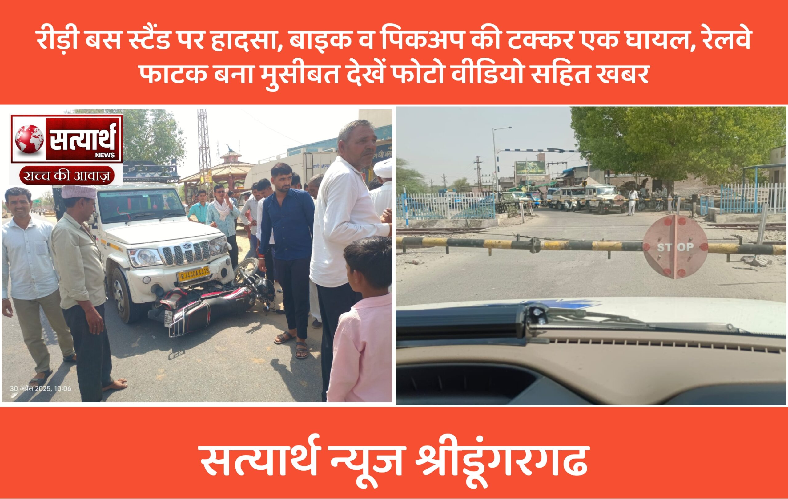 रीड़ी बस स्टैंड पर एक पिकअप और बाइक में टक्कर हो गई, जिससे बाइक सवार युवक गंभीर रूप से घायल हो गया। हादसे की सूचना मिलते ही डॉ. एपीजे अब्दुल कलाम वेलफेयर सोसायटी की क्विक एंबुलेंस मौके पर पहुंची और घायल को प्राथमिक उपचार के लिए श्रीडूंगरगढ़ उपजिला अस्पताल ले लाया गया। घायल की पहचान रीड़ी गांव निवासी 18 वर्षीय भवानी पुत्र रामेश्वरलाल जाट के रूप में हुई है। मौके पर मौजूद सेवादारों ने बताया कि एंबुलेंस जब युवक को लेकर अस्पताल जा रही थी, तभी बीदासर रोड स्थित रेलवे फाटक बंद मिला। करीब 10 मिनट फाटक के कारण एंबुलेंस को रोका गया और काफी देर तक इंतजार करना पड़ा। और आखिरकार घायल युवक को सामने से आ रही गाड़ी में शिफ्ट करके श्रीडूंगरगढ़ उपजिला अस्पताल भेजा गया