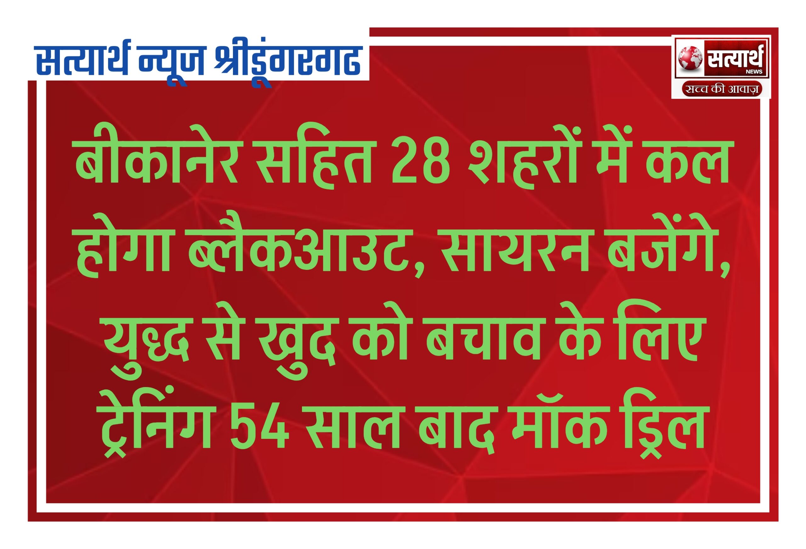 हमले के दौरान खुद को बचाने के लिए बुधवार को प्रदेश में 54 साल बाद सबसे बड़ी मॉक ड्रिल होने जा रही है। इसे लेकर प्रदेश के सभी जिलों में गाइड लाइन जारी कर दी है। मंगलवार को इस मॉक ड्रिल को लेकर शहरों के नाम भी जारी कर दिए है। प्रदेश में जयपुर-जोधपुर समेत 28 शहरों में युद्ध के हालातों से बचने के लिए ट्रेनिंग दी जाएगी। वहीं प्रदेश से सटे बॉर्डर इलाकों में भी अलर्ट जारी किया है। इस दौरान ब्लैक आउट भी होगा। इधर,देश में होनी वाली इस मॉक ड्रिल को लेकर राजस्थान सरकार ने तैयारी पूरी कर ली हैं। मंगलवार को सचिवालय में मुख्य सचिव की अध्यक्षता में एक मीटिंग होने जा रही है। इसमें होने वाली इस ड्रिल को लेकर पूरी रूप रेखा तैयार की जा रही हैं। सभी कलेक्टर और एसपी को इसे लेकर जानकारी शेयर की जाएगी। वहीं बीकानेर कलेक्टर नम्रता वर्षणी ने बताया कि जिले के सभी अधिकारी अलर्ट मोड पर है। मॉक ड्रिल को लेकर पूरी तैयारी है। शहर में अलग-अलग 10 जगह पर सायरन लगे है।
