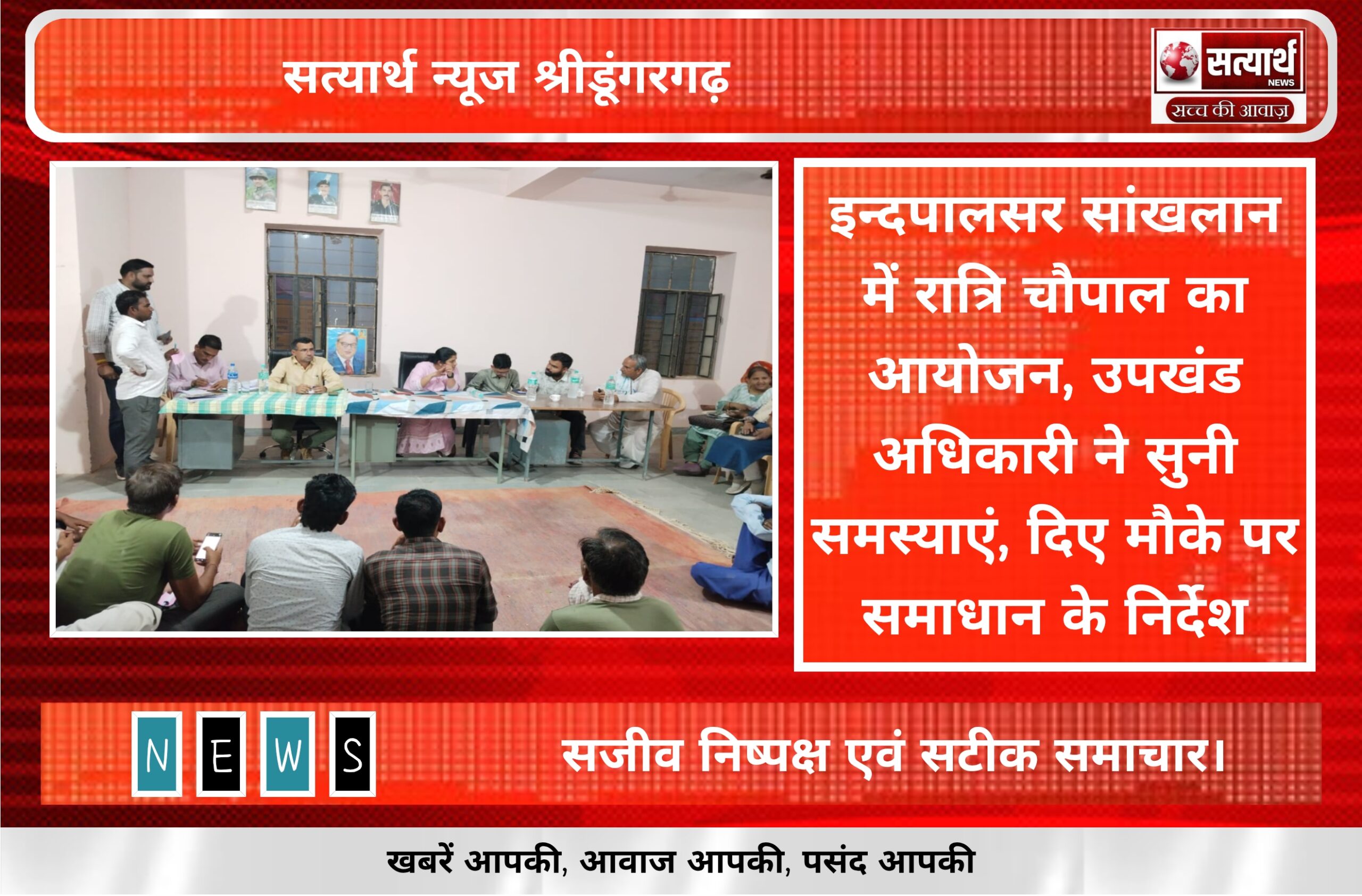 राज्य सरकार की संवेदनशील सुशासन नीति के तहत मंगलवार रात को श्रीडूंगरगढ़ उपखण्ड की ग्राम पंचायत इन्दपालसर सांखलान में रात्रि चौपाल का आयोजन कियाउपखंड अधिकारी उमा मित्तल ने ग्रामीणों की समस्याएं सुनीं और अधिकतर मामलों में मौके पर ही संबंधित विभागों को कार्रवाई के निर्देश दिए।