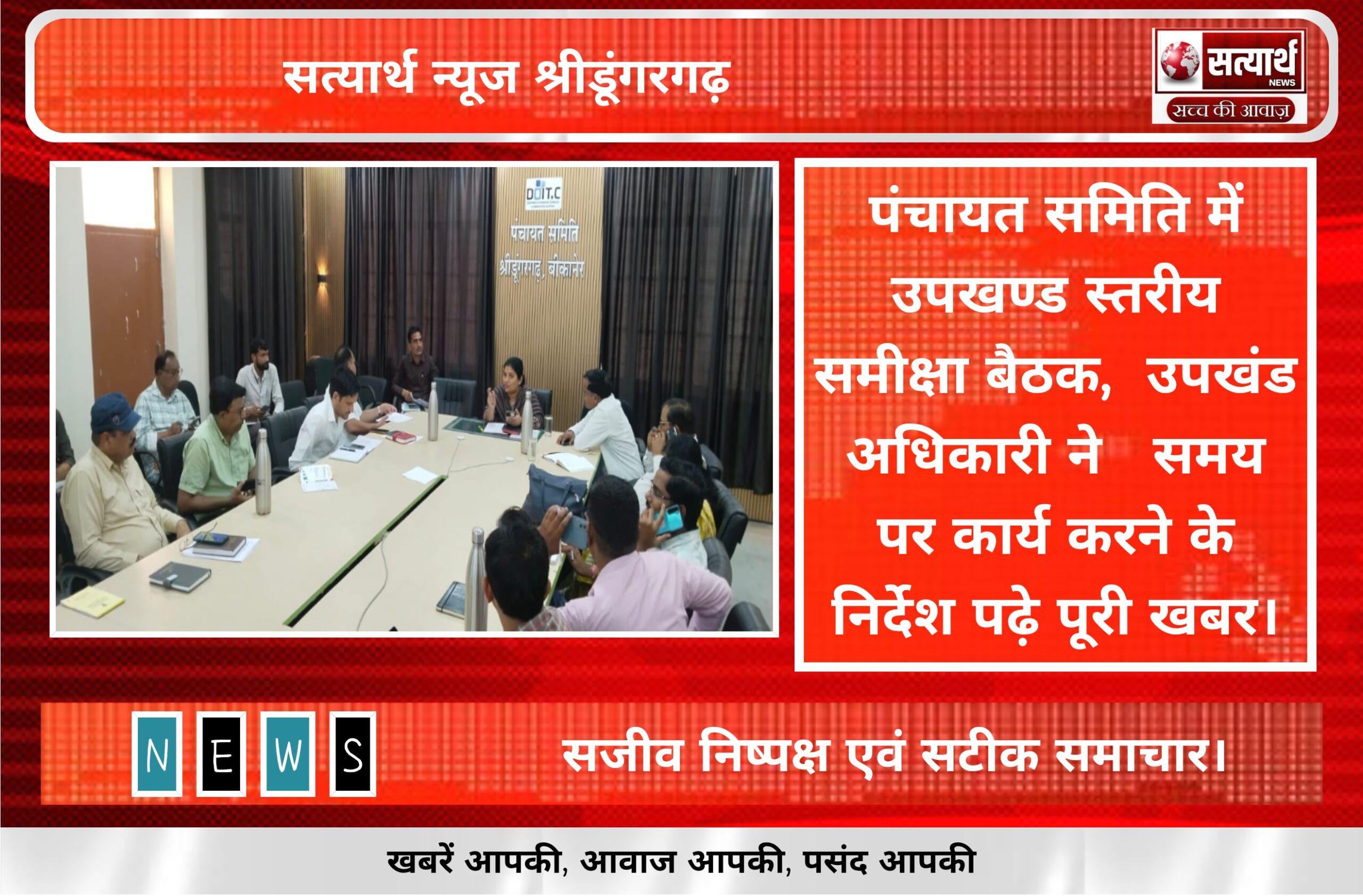 पंचायत समिति के वीडियो कॉन्फ्रेंसिंग कक्ष में बुधवार को उपखण्ड स्तरीय विभागाध्यक्षों की समीक्षा बैठक आयोजित की गई। बैठक की अध्यक्षता उपखण्ड अधिकारी उमा मित्तल ने की। बैठक में विभागवार कार्यों की समीक्षा कर विभिन्न स्तरीय आयोजित जनसुनवाई / रात्रि चौपाल कार्यक्रमों में प्राप्त परिवादों के समयबद्ध निस्तारण करने एवं पालना रिपोर्ट प्रेषित करने हेतु निर्देशित किया गया। उपखंड अधिकारी ने स्पष्ट निर्देश दिए कि जनसुनवाई एवं रात्रि चौपाल जैसे कार्यक्रमों में प्राप्त परिवादों का तत्काल और समयबद्ध निस्तारण किया जाए। साथ ही, उसकी पालना रिपोर्ट समय पर भेजने को कहा गया
