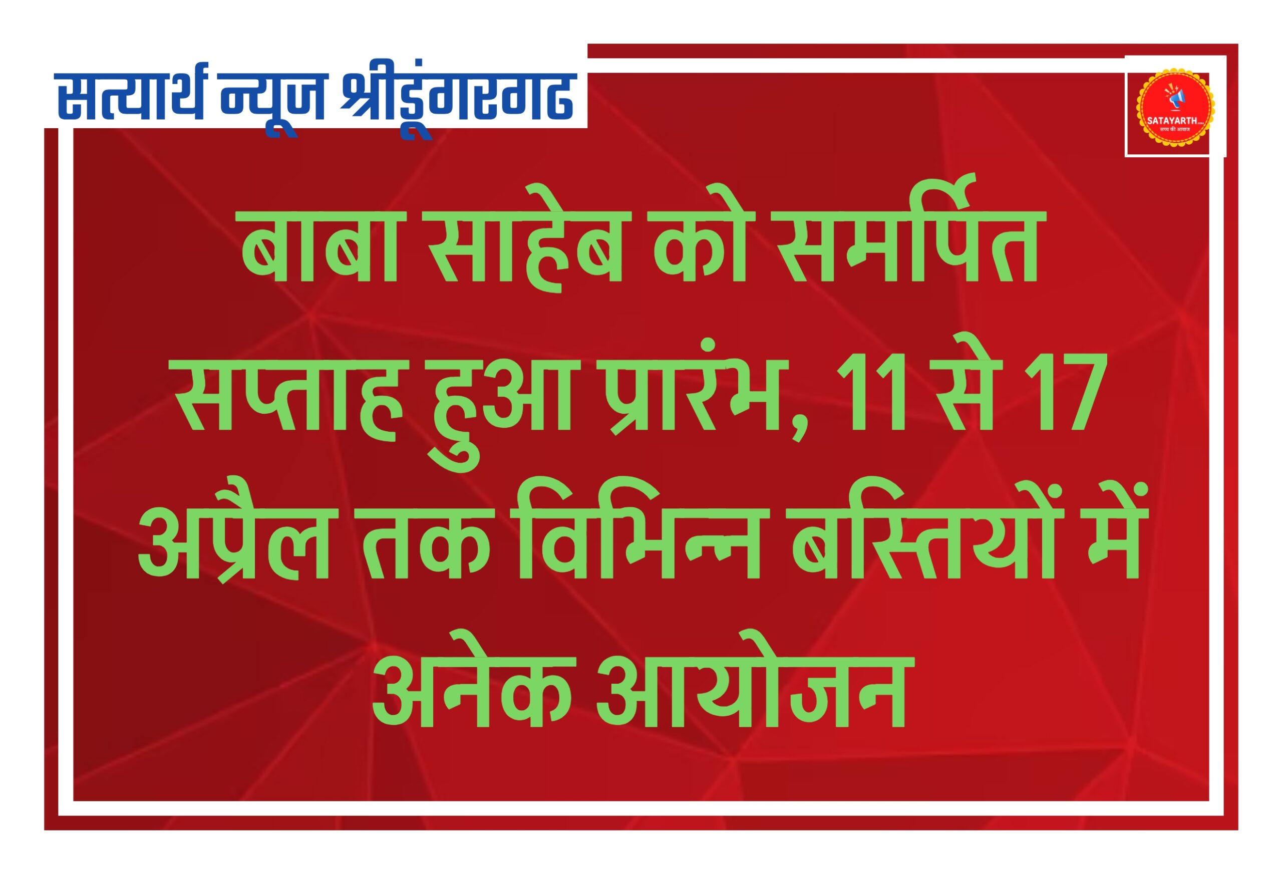 राष्ट्रीय स्वयंसेवक संघ एवं संवैचारिक संगठनों द्वारा 11 अप्रैल से 17 अप्रैल के बीच बाबा साहेब भीमराव अंबेडकर जयंती सप्ताह का आयोजन किया जा रहा है जिसमें श्रीडूंगरगढ़ की विभिन्न बस्तियों में संघ एवं संवैचारिक संगठनों द्वारा विभिन्न कार्यक्रमों का आयोजन किया जाएगा । श्रीडूंगरगढ़ कस्बे में अंबेडकर बस्ती (कालू बास) प्रताप बस्ती, वाल्मीकि बस्ती (मोमासर बास) मेघवाल बस्ती (बिग्गा बास) गंवारिया बस्ती (आडसर बास) नटिया बस्ती (आडसर बास), संत रविदास बस्ती और साटीया बस्ती (आडसर बास) में अलग अलग संगठनों के कार्यकर्ता समाज में समरसता एवं सदभावना का संदेश देंगे। जयंती सप्ताह के दौरान अखिल भारतीय साहित्य परिषद् परिषद् द्वारा बाबा साहब के जीवन से जुड़े प्रसंग एवं व्याख्यान तथा प्रश्नोत्तरी प्रतियोगिता, शिक्षक संघ राष्ट्रीय द्वारा आवश्यक दस्तावेज की जानकारी, विश्व हिन्दू परिषद् द्वारा बस्ती के स्थानीय मंदिर में आरती का आयोजन, राष्ट्रीय सेविका समिति द्वारा परिवारों में मातृशक्ति से संपर्क, विद्या भारती द्वारा चित्रकला प्रतियोगिता, सेवा भारती द्वारा हवन, धर्म जागरण गतिविधि तथा अखिल भारतीय विद्यार्थी परिषद् के संयुक्त तत्वावधान में सत्संग का आयोजन किया गया। अनेक क्रियाकलापों से बाबा साहब द्वारा प्रचारित जनचेतना समर्पण,सेवा,मानवीय मूल्यों पर्यावरण आदि विषयों पर जानकारियां प्रदान की गई।