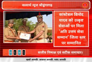 राजस्थान पुलिस स्थापना दिवस के मौके पर आयोजित कार्यक्रम में श्रीडूंगरगढ़ सीओ कार्यालय में तैनात कांस्टेबल विनोद कुमार यादव को बीकानेर जिला पुलिस अधीक्षक कावेंद्र सिंह सागर ने “अति उत्तम सेवा सम्मान” से सम्मानित किया गया। यह सम्मान उन्हें कानून व्यवस्था बनाए रखने में उनकी सतत सक्रियता, कर्तव्यनिष्ठा और जनसेवा के प्रति संवेदनशील रवैये के लिए प्रदान किया गया। समारोह में पुलिस विभाग के कई वरिष्ठ अधिकारी व कर्मचारी मौजूद रहे। इस अवसर पर पुलिस अधीक्षक सागर ने कहा कि इस प्रकार के पुरस्कार न केवल कर्मियों के मनोबल को बढ़ाते हैं, बल्कि पूरे विभाग के लिए भी प्रेरणा का स्रोत बनते हैं।