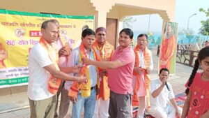 पतंजलि परिवार के पदाधिकारीयों द्वारा 25 दिवसीय योग शिविर के सूत्रधार भारत स्वाभिमान जिला कोषाध्यक्ष जितेंद्र कुमार सिंह व उपस्थित सभी योग प्रशिक्षुओं को अंग वस्त्र से सम्मानित किया गया।