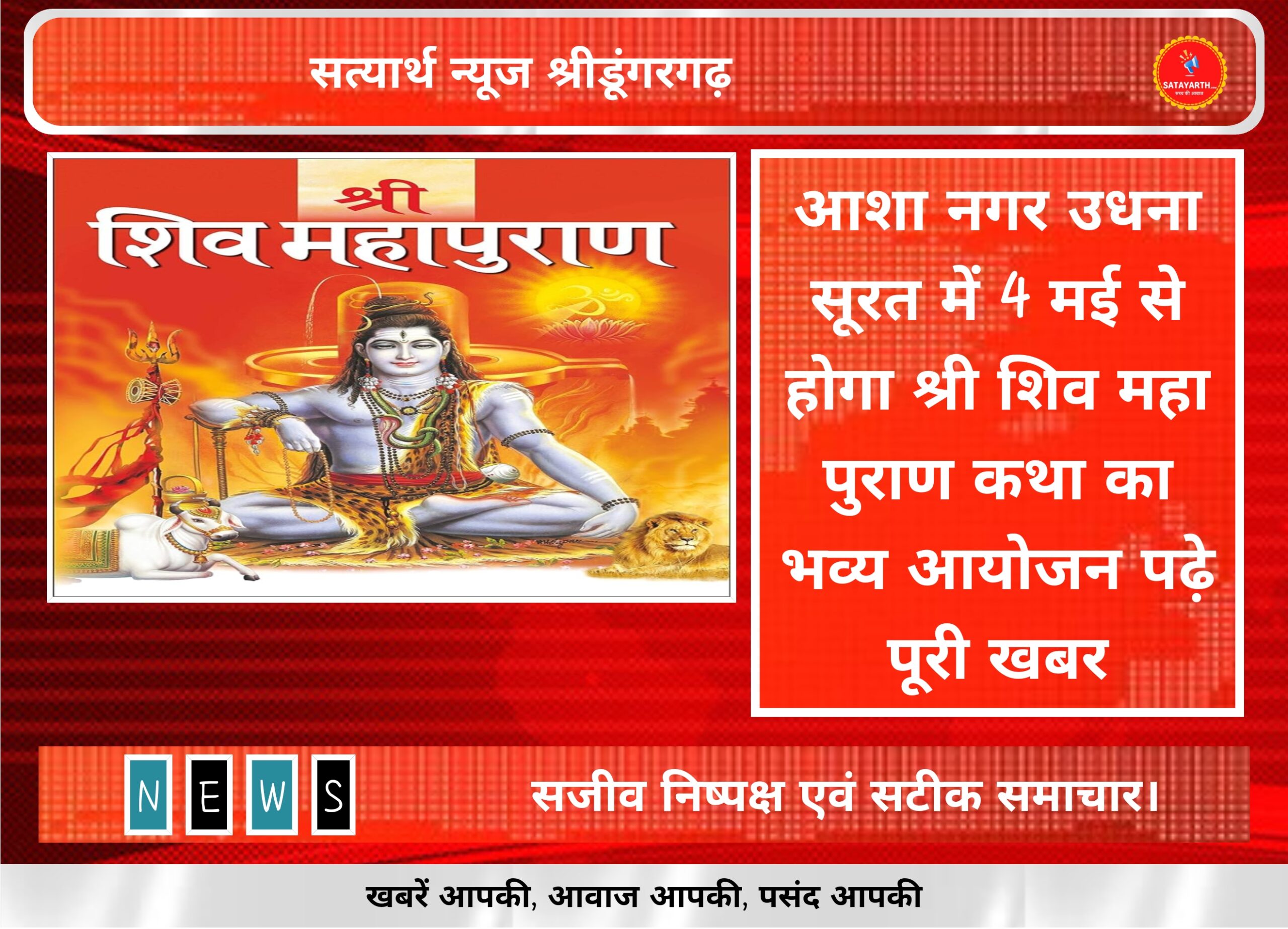 उधना आशा नगर सोसाइटी-1 में प्रथम सार्वजनिक श्री शिव महा पुराण कथा ज्ञान यज्ञ का भव्य आयोजन श्री रामायण प्रचार मण्डल,उधना-सूरत के तत्वाधान में बैसाख मास के पावन अवसर पर रविवार 04 मई से 10 मई 2025 तक किया जाएगा,कथा का स्थान आशा नगर सोसायटी1 राजस्थान विद्यालय के सामने,उधना-सूरत में किया जाएगा व्यास पीठ पर श्री संदीप जी महाराज प्रतिदिन दोपहर 3 बजे से सांय 6:15 बजे तक कथा का रसपान कराएंगे भव्य कलश यात्रा रविवार 04 मई 2025 को सुबह 8 बजे श्री लाभेश्वर महादेव मंदिर, रणछोड़ नगर,उधना से कथा स्थल तक आयेगी एवम कथा पूर्णाहुति हवन 11 मई 2025 रविवार को सुबह 8:15 बजे किया जाएगा,प्रचार मण्डल ने सभी सनातनी बंधु को श्री शिव महा पुराण कथा ज्ञान यज्ञ सप्ताह के आयोजन में सपरिवार पधारने की अपील की है।