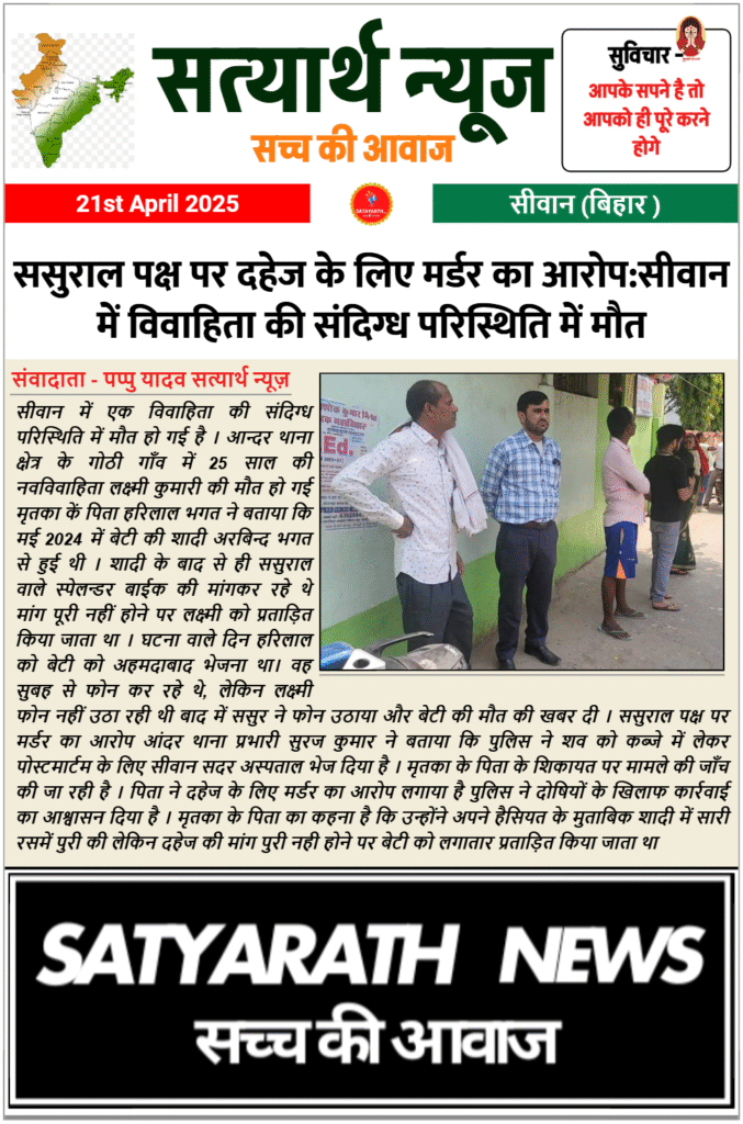 सीवान में एक विवाहिता की संदिग्ध परिस्थिति में मौत हो गई है । आन्दर थाना क्षेत्र के गोठी गाँव में 25 साल की नवविवाहिता लक्ष्मी कुमारी की मौत हो गई । मृतका कें पिता हरिलाल भगत ने बताया कि मई 2024 में बेटी की शादी अरबिन्द भगत से हुई थी ।