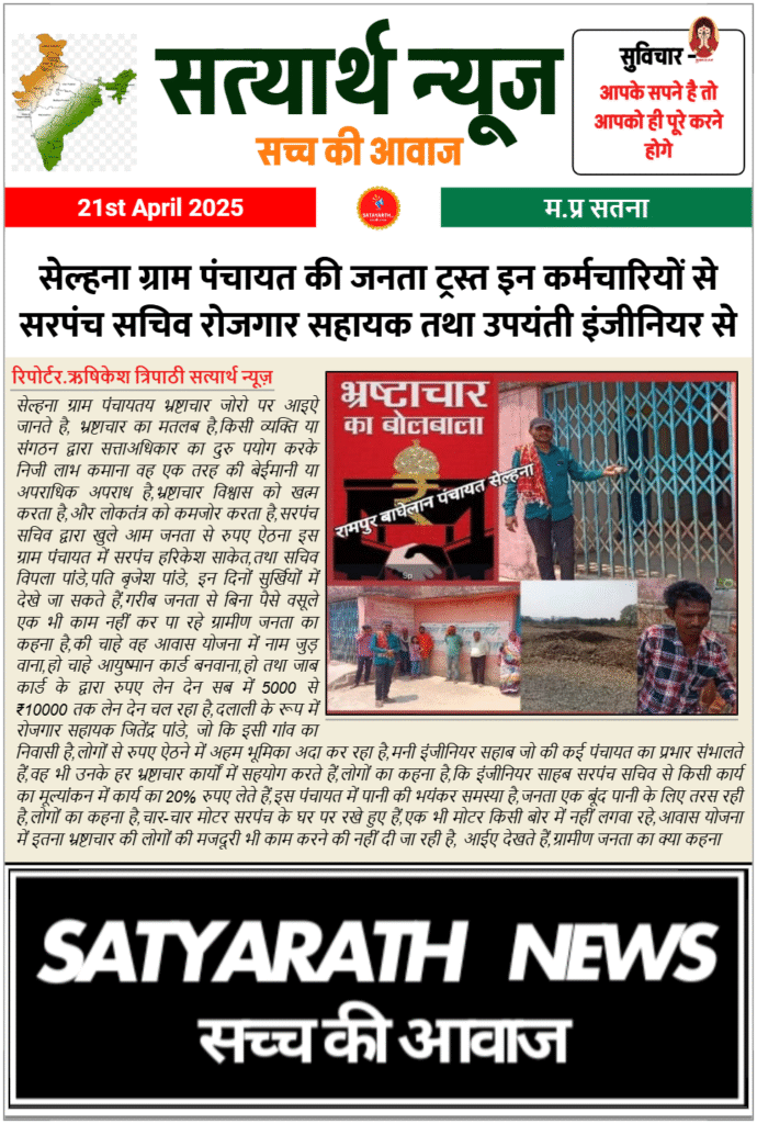 सेल्हना ग्राम पंचायतय भ्रष्टाचार जोरो पर आइऐ जानते है, भ्रष्टाचार का मतलब है,किसी व्यक्ति या संगठन द्वारा सत्ताअधिकार का दुरु पयोग करके निजी लाभ कमाना वह एक तरह की बेईमानी या अपराधिक अपराध है,भ्रष्टाचार विश्वास को खत्म करता है,और लोकतंत्र को कमजोर करता है,सरपंच सचिव द्वारा खुले आम जनता से रुपए ऐठना इस ग्राम पंचायत में सरपंच हरिकेश साकेत,तथा सचिव विपला पांडे,पति बृजेश पांडे, इन दिनों सुर्खियों में देखे जा सकते हैं