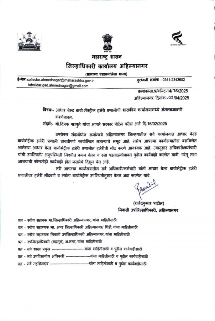 अहिल्या नगर जिल्ह्यातील शासकीय व निमशासकीय कर्मचारी/अधिकाऱ्यांची वेळेवर उपस्थिती आणि बायोमेट्रिक हजेरी अनिवार्य करण्याची मागणी.