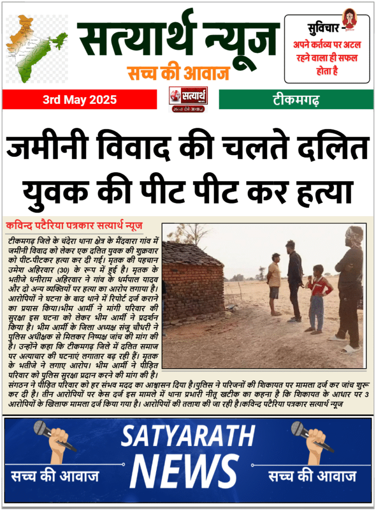 टीकमगढ़ जिले के चंदेरा थाना क्षेत्र के मैंदवारा गांव में जमीनी विवाद को लेकर एक दलित युवक की शुक्रवार को पीट-पीटकर हत्या कर दी गई। मृतक की पहचान उमेश अहिरवार (30) के रूप में हुई है। मृतक के भतीजे धनीराम अहिरवार ने गांव के धर्मपाल यादव और दो अन्य व्यक्तियों पर हत्या का आरोप लगाया है। आरोपियों ने घटना के बाद थाने में रिपोर्ट दर्ज कराने का प्रयास किया।भीम आर्मी ने मांगी परिवार की सुरक्षा इस घटना को लेकर भीम आर्मी ने प्रदर्शन किया है। भीम आर्मी के जिला अध्यक्ष संजू चौधरी ने पुलिस अधीक्षक से मिलकर निष्पक्ष जांच की मांग की है। उन्होंने कहा कि टीकमगढ़ जिले में दलित समाज पर अत्याचार की घटनाएं लगातार बढ़ रही हैं। मृतक के भतीजे ने लगाए आरोप। भीम आर्मी ने पीड़ित परिवार को पुलिस सुरक्षा प्रदान करने की मांग की है। संगठन ने पीड़ित परिवार को हर संभव मदद का आश्वासन दिया है।पुलिस ने परिजनों की शिकायत पर मामला दर्ज कर जांच शुरू कर दी है। तीन आरोपियों पर केस दर्ज इस मामले में थाना प्रभारी नीतू खटीक का कहना है कि शिकायत के आधार पर 3 आरोपियों के खिलाफ मामला दर्ज किया गया है। आरोपियों की तलाश की जा रही है।