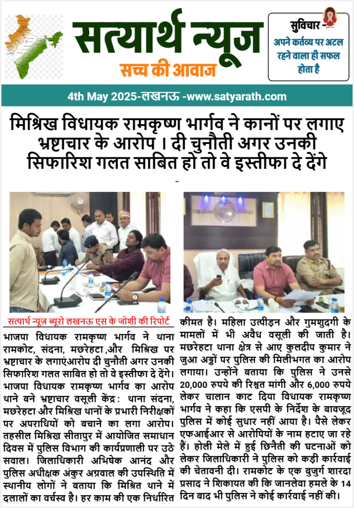 भाजपा विधायक रामकृष्ण भार्गव का आरोप थाने बने भ्रष्टाचार वसूली केंद्र : थाना संदना, मछरेहटा और मिश्रिख थानों के प्रभारी निरीक्षकों पर अपराधियों को बचाने का लगा आरोप। तहसील मिश्रिख सीतापुर में आयोजित समाधान दिवस में पुलिस विभाग की कार्यप्रणाली पर उठे सवाल। जिलाधिकारी अभिषेक आनंद और पुलिस अधीक्षक अंकुर अग्रवाल की उपस्थिति में स्थानीय लोगों ने बताया कि मिश्रित थाने में दलालों का वर्चस्व है। हर काम की एक निर्धारित कीमत है। महिला उत्पीड़न और गुमशुदगी के मामलों में भी अवैध वसूली की जाती है। मछरेहटा थाना क्षेत्र से आए कुलदीप कुमार ने जुआ अड्डों पर पुलिस की मिलीभगत का आरोप लगाया।