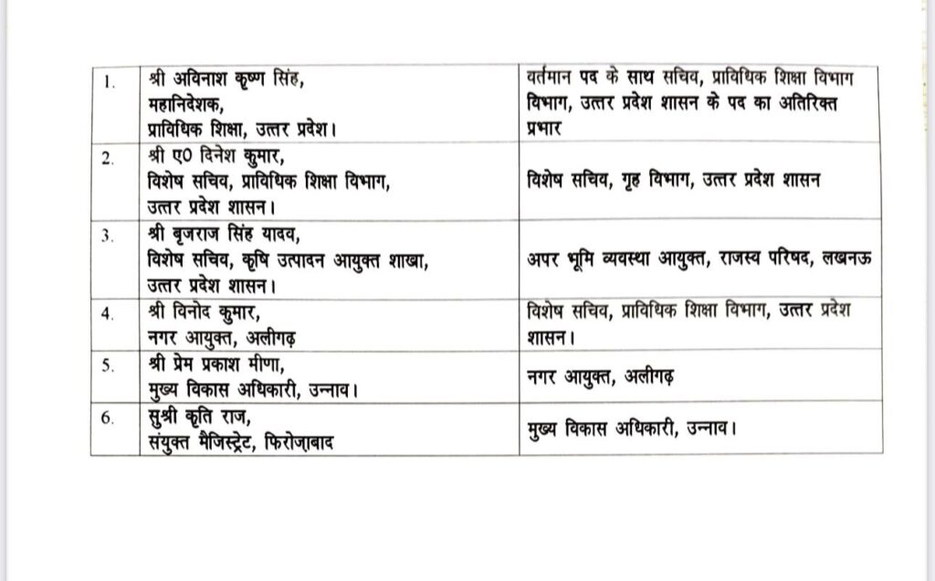 प्राविधिक शिक्षा विभाग में विशेष सचिव के पद पर तैनात ए दिनेश कुमार को विशेष सचिव गृह बनाया गया है। कृषि उत्पादन आयुक्त शाखा में विशेष सचिव के पद पर तैनात बृजराज सिंह यादव को राजस्व परिषद लखनऊ में अपर भूमि व्यवस्था आयुक्त के पद पर तैनात किया गया है । इसी प्रकार अलीगढ़ में नगर आयुक्त विनोद कुमार को प्राविधिक शिक्षा में विशेष सचिव बनाया गया है। मुख्य विकास अधिकारी उन्नाव प्रेम प्रकाश मीणा को अलीगढ़ का नगर आयुक्त बनाया गया है। संयुक्त मजिस्ट्रेट फिरोजाबाद कृति राज को उन्नाव का मुख्य विकास अधिकारी बनाया गया है।