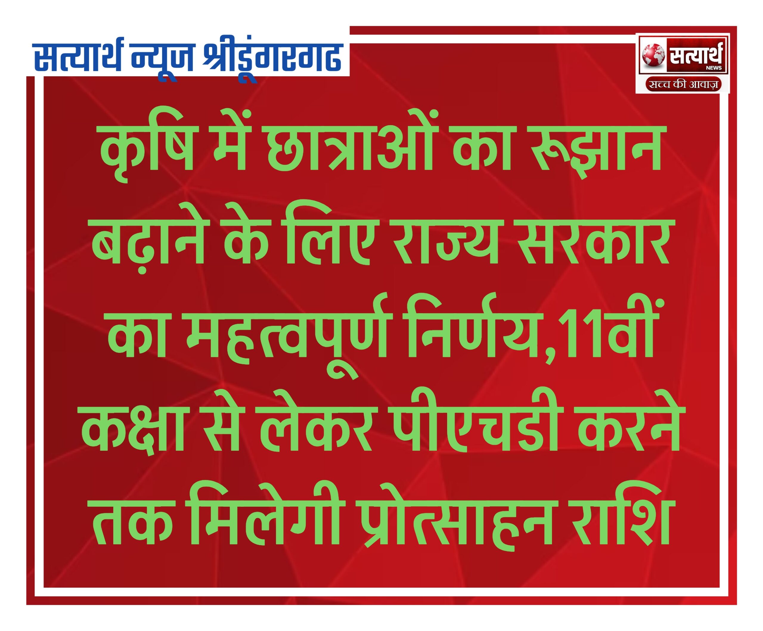 मुख्यमंत्री श्री भजन लाल शर्मा के नेतृत्व में राज्य सरकार द्वारा लगातार प्रदेश में विभिन्न वर्गों के कल्याण के लिए कई निर्णय लिए गए हैं। इसी कडी में राज्य सरकार ने कृषि विषय लेकर अध्ययन करने वाली छात्राओं को 11वीं से लेकर पीएचडी करने तक प्रोत्साहन राशि देने का निर्णय किया है। ग्रामीण एवं शहरी अंचल की आर्थिक रूप से कमजोर वर्ग की ऐसी छात्राएं जो दसवीं कक्षा उत्तीर्ण करने के बाद 11वीं में कृषि विषय लेना चाहती हैं और कृषि विषय में ही उच्च अध्ययन करना चाहती हैं उन्हें यह प्रोत्साहन राशि दी जाएगी। योजना में आवेदन की अंतिम तिथि 31 जनवरी 2026 तक होगी।
