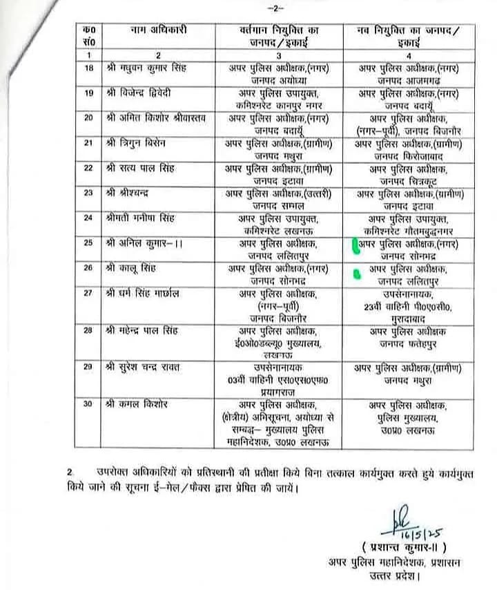 सोनभद्र। जनपद के निवर्तमान एडिशनल एसपी का गैर जनपद स्थानांतरण हो गया है। शासन द्वारा उन्हें स्थानांतरित कर ललितपुर में बतौर एडिशनल एसपी भेजा गया है। वहीं उनकी जगन ललितपुर के निवर्तमान एडिशनल एसपी अनिल कुमार को सोनभद्र जिले का नया एडिशनल एसपी नियुक्त किया गया है।
