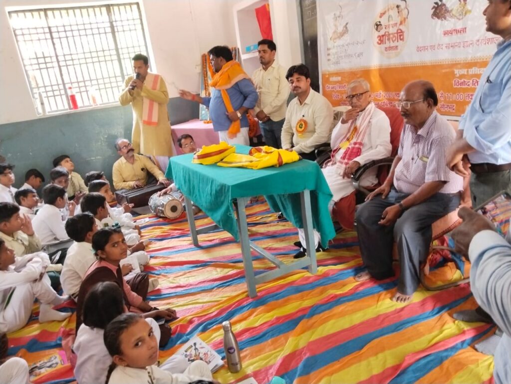 स्थानीय ग्रीनफील्ड पब्लिक स्कूल में आयोजित वेदगायन व सामान्य वेदज्ञान कार्यशाला के पांचवे दिन का प्रारम्भ कार्यक्रम के मुख्य अतिथि जिला बेसिक शिक्षा अधिकारी मुकुल आनन्द पाण्डेय व विशिष्ट अतिथि लालजी तिवारी ने मां ज्ञानदायिनी के समक्ष दीपप्रज्ज्वलन कर किया। अतिथियों का स्वागत जनपदीय समन्वयक दीनबन्धु त्रिपाठी ने वेदतिलक ,माल्यार्पण, व अंगवस्त्रम प्रदान कर किया।उन्होंने बताया कि कार्यशाला का आज पांचवा दिन है,कार्यशाला में आज वेद के अंगों व विशेष रूप से सामवेद जो संगीत से सम्बंधित है,ज्ञान कराया जायेगा।