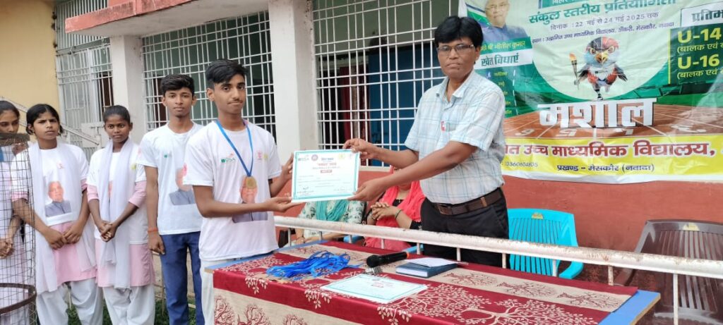 बिहार के प्रतिभावान खिलाड़ियों के चयन हेतु खेल प्रतियोगिता मशाल 2024 का आयोजन संपन्न हो गया। 22 से 24 मई तक चलने वाले इस सीआरसी स्तरीय प्रतियोगिता में एथलेटिक्स, कबड्डी, साइक्लिंग, आदि विभिन्न प्रतियोगिताओं में सैकड़ों छात्र-छात्राओं ने पूरे उत्साह के साथ भाग लिया। उल्लेखनीय है कि उत्क्रमित उच्च माध्यमिक विद्यालय अँकरी में आयोजित समापन समारोह के दौरान मशाल 2024 खेल प्रतियोगिता में उम्दा प्रदर्शन करने वाले खिलाड़ियों को मेडल एवं प्रशस्ति पत्र से सम्मानित किया गया। साइक्लिंग में जहाँ छात्रा में आरती कुमारी ने एवं छात्र में मनीष शर्मा ने बाजी मारी, वहीं कबड्डी में अंडर 16 छात्रा की ग्रुप कैप्टन अनमिका कुमारी के नेतृत्व राजनंदनी कुमारी, सोनाली कुमारी, महिका सिन्हा आदि ने अपनी जीत दर्ज की जबकि अंडर 16 के छात्र अभिजीत कुमार, सुमीत कुमार, अंकुल कुमार आदि