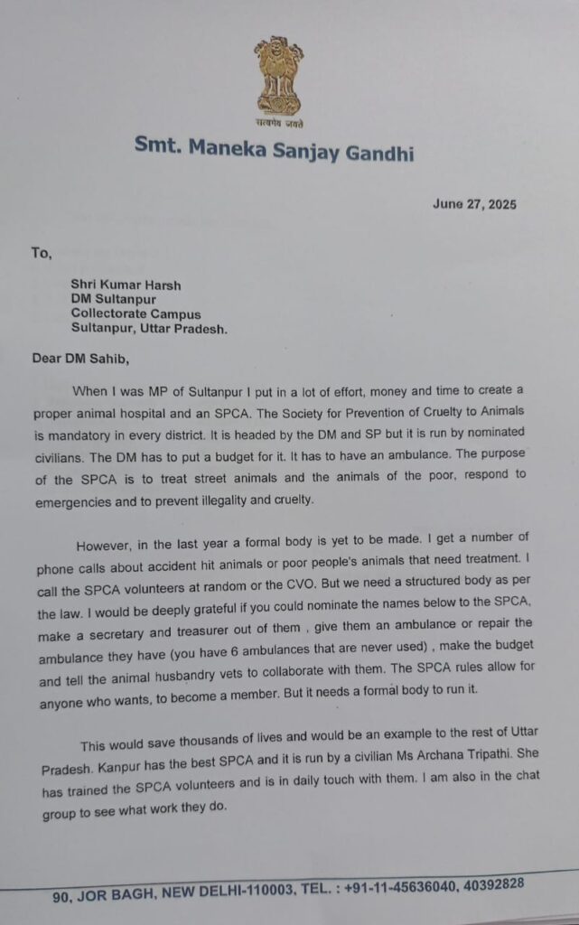 सुल्तानपुर की पूर्व सांसद मेनका गांधी फिर हुई सक्रिय डीएम को लिखा पत्र, पशु क्रूरता निवारण सोसाइटी गठन को बताया आवश्यक