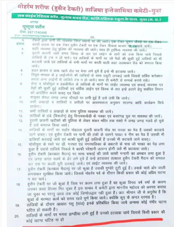 गुना में मोहर्रम जुलूस से पहले एक विवाद खड़ा हो गया जब ताजिया इंतजामिया कमेटी ने कलेक्टर को दिए पत्र में जुलूस मार्ग पर लगे भगवा झंडों को हटवाने की मांग की।