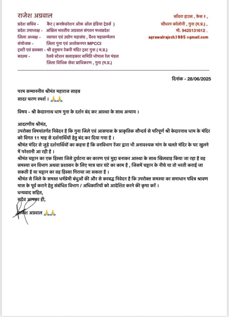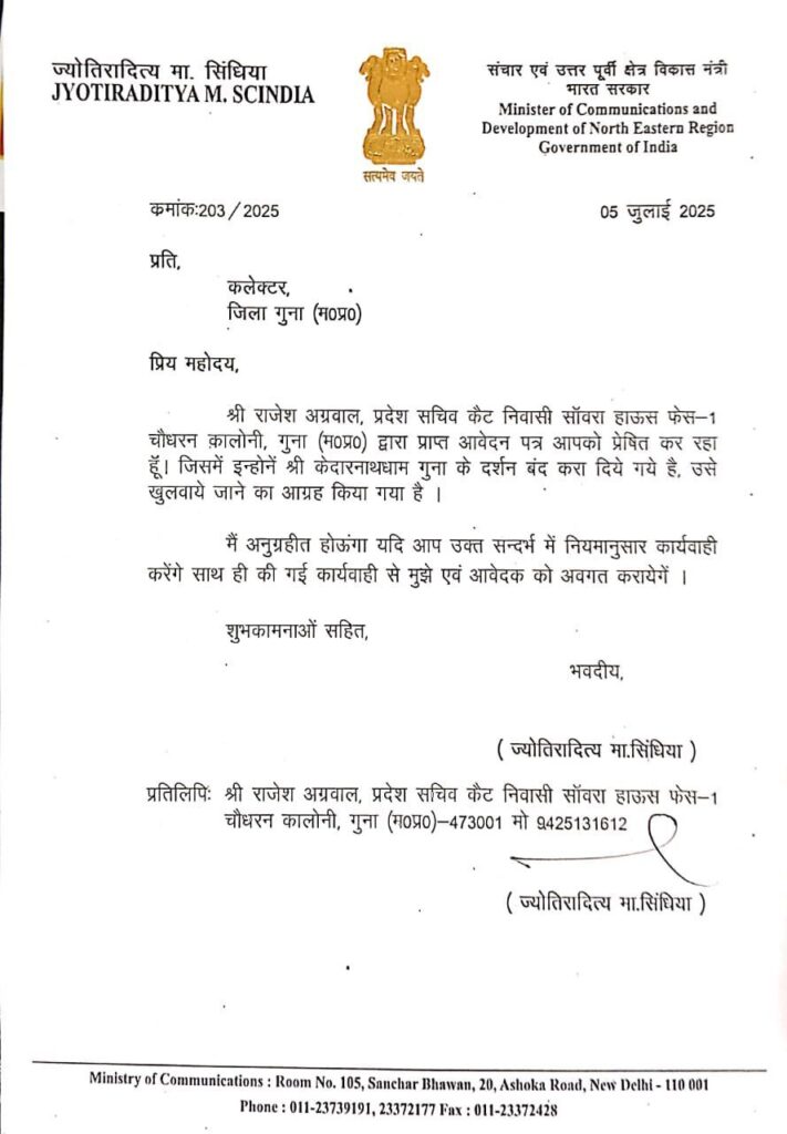क्षेत्रीय सांसद श्री सिंधिया द्वारा धर्म के प्रति अपनी अगाध आस्था के चलते जिलाधीश गुना को एक पत्र लिखा गया है जो कि केदारनाथ मंदिर के पट खोले जाने संदर्भित है