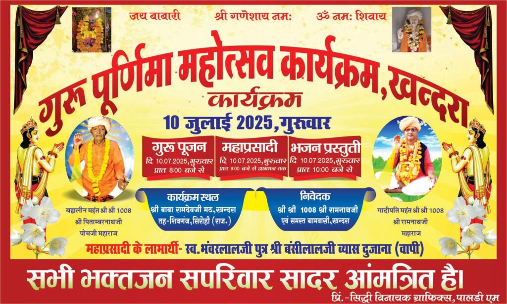 खदरा गुरु पूर्णिमा महोत्सव कार्यक्रम में कार्यक्रम पुज्य बहालीन संत श्री 1008 श्री पीताम्बर नाथजी महाराज पोमजी महाराज के निर्देश में बाबा रामदेव आश्रम खदरा में गुरु पूर्णिमा महोत्सव में 10 जुलाई गुरुवार को मनाया जाएगा गुरु पुजन प्रातः 8 बजे से महाप्रसादी प्रातः 9 बजे से भजन प्रस्तुती प्रातः 10 बजे से गुरु पूर्णिमा के उपलक्ष में गादिपति श्रीं श्रीं 1008 श्री रामनाथ जी महाराज श्री बाबा रामदेव जी महाराज खदरा मठ में सभी भक्तों को सादर आमंत्रित महा प्रसादी के लाभार्थी स्व भंवरलाल जी पुत्र बंशीलालजी व्यास दुजाना (वापी)