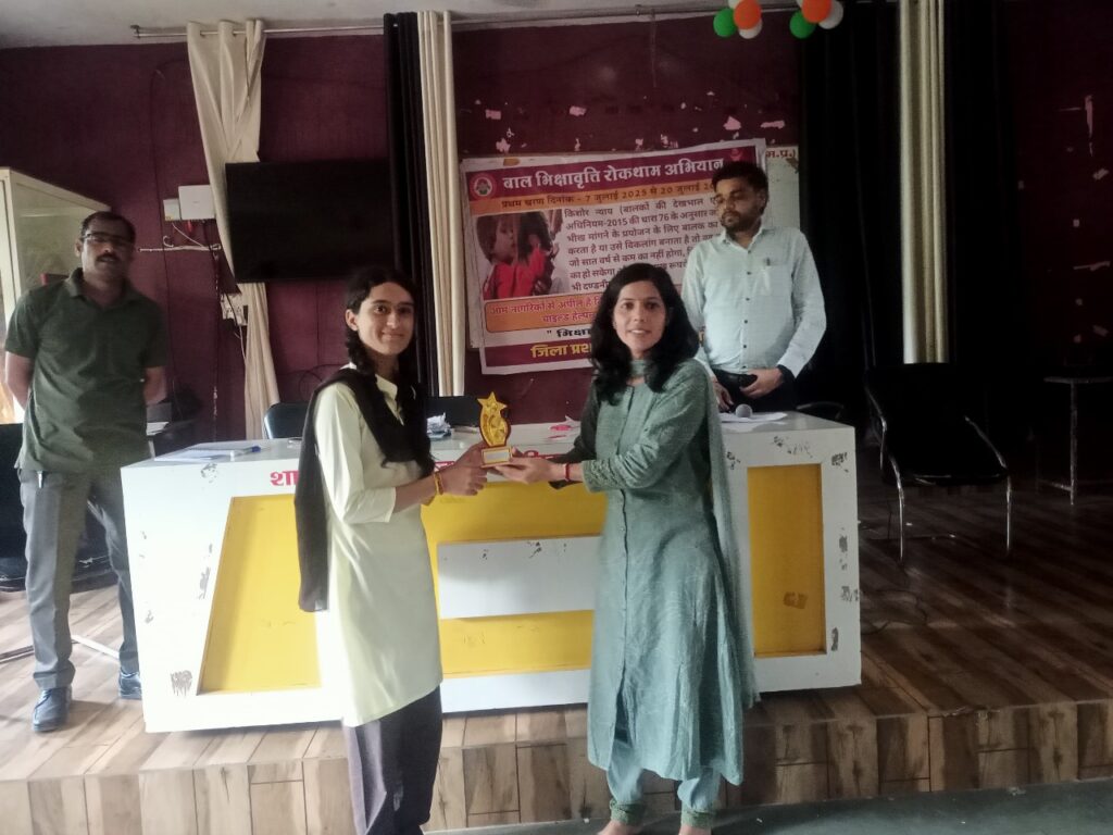 श्री विजय साहू महिला एवं बाल विकास द्वारा बच्चों को बताया कि बाल भिक्षावृत्ति एवं बच्चों से संबंधित समस्याओं की जानकारी चाईल्ड हेल्पलाईन नम्बर 1098 पर सूचना देकर विभाग को अवगत करा सकते हैं। भिक्षावृत्ति रोकथाम के लिये शासकीय उत्कृष्ट उच्चतर माध्यमिक विद्यालय गुना में निबंध प्रतियोगिता आयोजित की गई। निबंध प्रतियोगिता में पार्थ शर्मा ने प्रथम, सृष्टि देशमुख ने द्वितीय एवं हिमान्शु शिवहरे ने तृतीय स्थान प्राप्त किया, जिन्हे शील्ड प्रदान कर पुरूस्कृत किया गया। उक्त कार्यशाला में शासकीय उत्कृष्ट उच्चतर माध्यमिक विद्यालय प्राचार्य श्री एच.एन. जाटव एवं समस्त शिक्षकगण उपस्थित रहे।- मध्य प्रदेश गुना गुना रिपोर्टर अभिषेक शर्मा