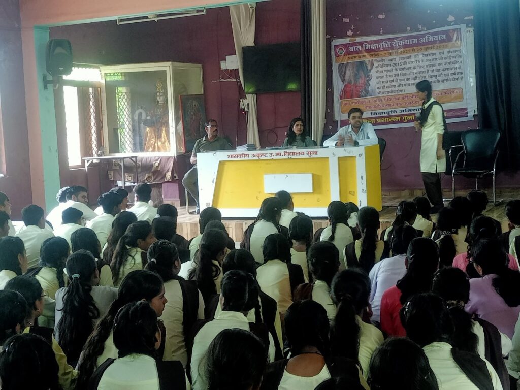 जिले में बाल भिक्षावृत्ति रोकथाम अभियान चलाया जा रहा है। अभियान अंतर्गत आज अब्दुल गफ्फार जिला कार्यक्रम अधिकारी महिला एवं बाल विकास विभाग के मार्गदर्शन में भिक्षावृत्ति रोकथाम हेतु शासकीय उत्कृष्ट उच्चतर माध्यमिक विद्यालय गुना में जागरूकता कार्यशाला एवं निबंध प्रतियोगिता आयोजित की गई। गिरिजा जाटव प्रशासक वन स्टॉप सेन्टर द्वारा बताया गया कि बाल भिक्षावृत्ति एक अपराध है, जिसमें भिक्षा लेना व भिक्षा देना दोनों अपराध है। बाल अधिनियम 1960 की धारा 42 के अनुसार जो कोई भी किसी बच्चे को भिक्षावृत्ति के लिए प्रेरित करता हैं, उसे 07 से 10 वर्ष तक की कैद एवं 05 लाख तक का जुर्माना या दोनों की सजा हो सकती है।
