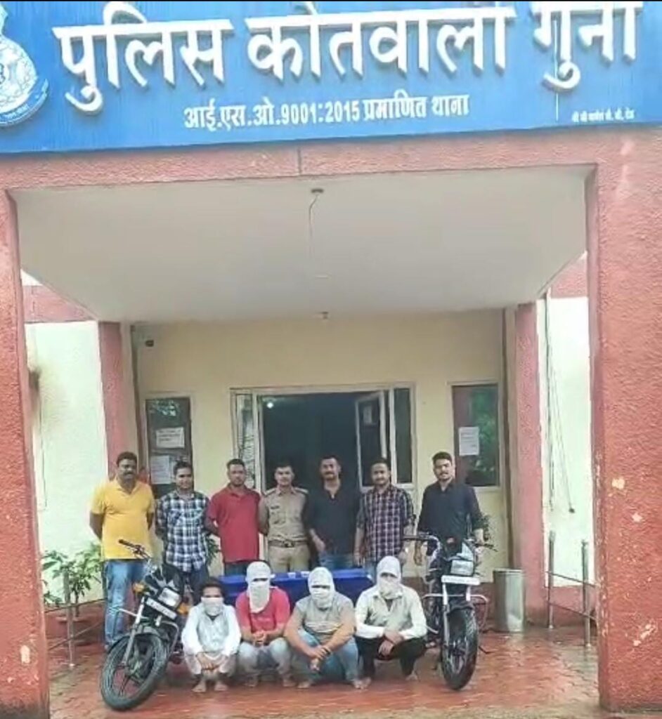 शहर में हुई एक लूट की वारदात को गुना कोतवाली पुलिस ने महज 4 घंटे के भीतर सुलझाते हुए चार अज्ञात आरोपियों को गिरफ्तार कर लिया है। इस कार्रवाई में लूटी गई सोने की अंगूठी, 4,000 नकद राशि और वारदात में प्रयुक्त दो मोटरसाइकिलों सहित कुल 2.34 लाख का मशरूका बरामद किया गया है। जानकारी के अनुसार, फरियादी राजेश पुत्र नारायण प्रसाद राय, निवासी बीना जिला सागर हाल निवासी तलैया मोहल्ला गुना ने 17 जुलाई को कोतवाली में रिपोर्ट दर्ज कराई थी कि सुबह जयस्तंभ चौराहा से हनुमान चौराहा की ओर जाते समय, जैसे ही वह पटेरिया भोजनालय के पास पहुँचा, तभी दो मोटरसाइकिलों पर सवार चार अज्ञात बदमाशों ने उसे रोका। आरोपियों ने उसकी उंगली में पहनी सोने की अंगूठी और जेब में रखे 5,000 लूट लिए और वहां से फरार हो गए।