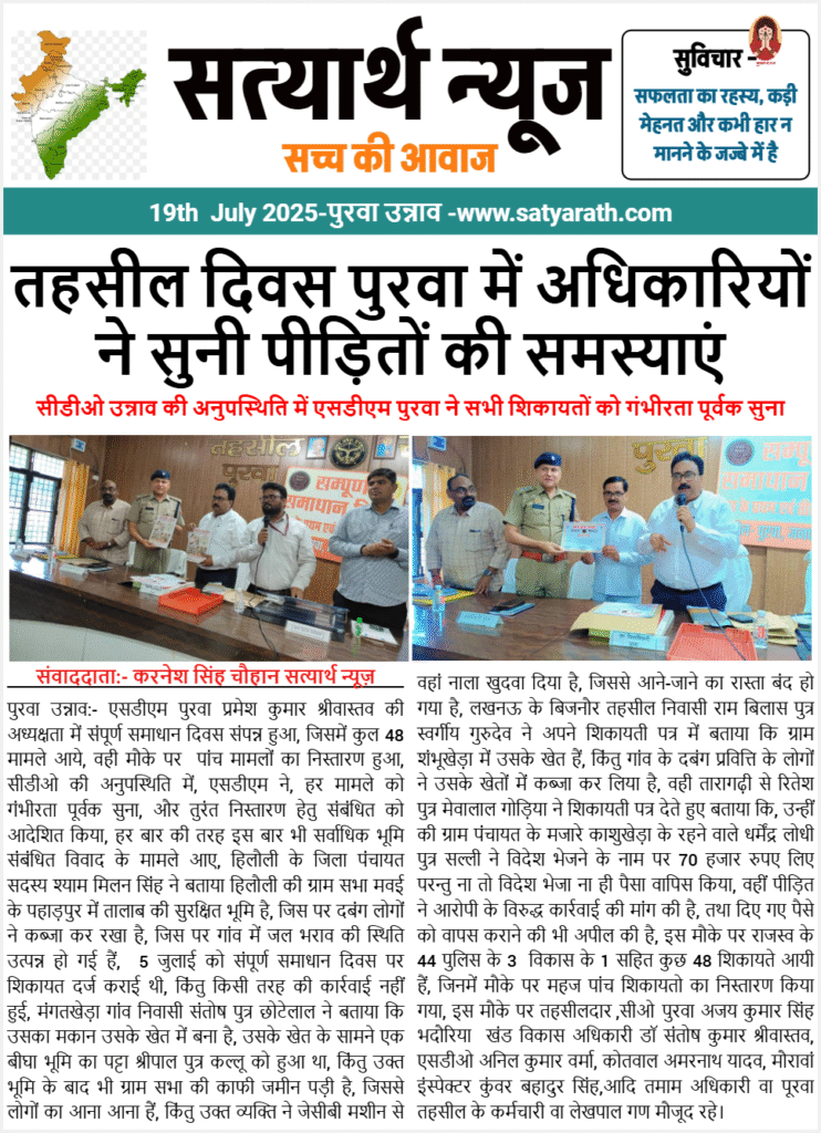 ✍️पुरवा उन्नाव:- एसडीएम पुरवा प्रमेश कुमार श्रीवास्तव की अध्यक्षता में संपूर्ण समाधान दिवस संपन्न हुआ, जिसमें कुल 48 मामले आये, वही मौके पर पांच मामलों का निस्तारण हुआ, सीडीओ की अनुपस्थिति में, एसडीएम ने, हर मामले को गंभीरता पूर्वक सुना, और तुरंत निस्तारण हेतु संबंधित को आदेशित किया, हर बार की तरह इस बार भी सर्वाधिक भूमि संबंधित विवाद के मामले आए, हिलौली के जिला पंचायत सदस्य श्याम मिलन सिंह ने बताया हिलौली की ग्राम सभा मवई के पहाड़पुर में तालाब की सुरक्षित भूमि है, जिस पर दबंग लोगों ने कब्जा कर रखा है, जिस पर गांव में जल भराव की स्थिति उत्पन्न हो गई हैं, 5 जुलाई को संपूर्ण समाधान दिवस पर शिकायत दर्ज कराई थी, किंतु किसी तरह की कार्रवाई नहीं हुई, मंगतखेड़ा गांव निवासी संतोष पुत्र छोटेलाल ने बताया कि उसका मकान उसके खेत में बना है, उसके खेत के सामने एक बीघा भूमि का पट्टा श्रीपाल पुत्र कल्लू को हुआ था,