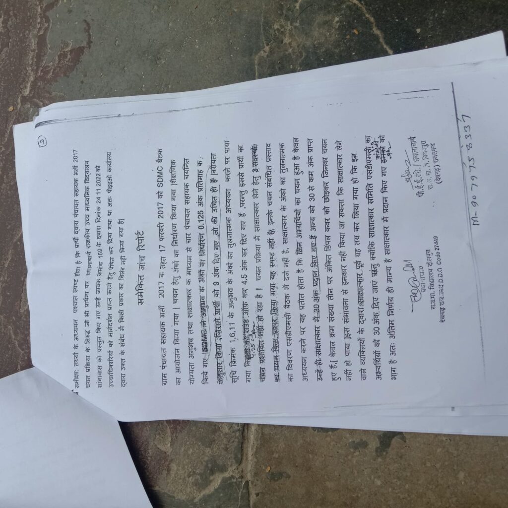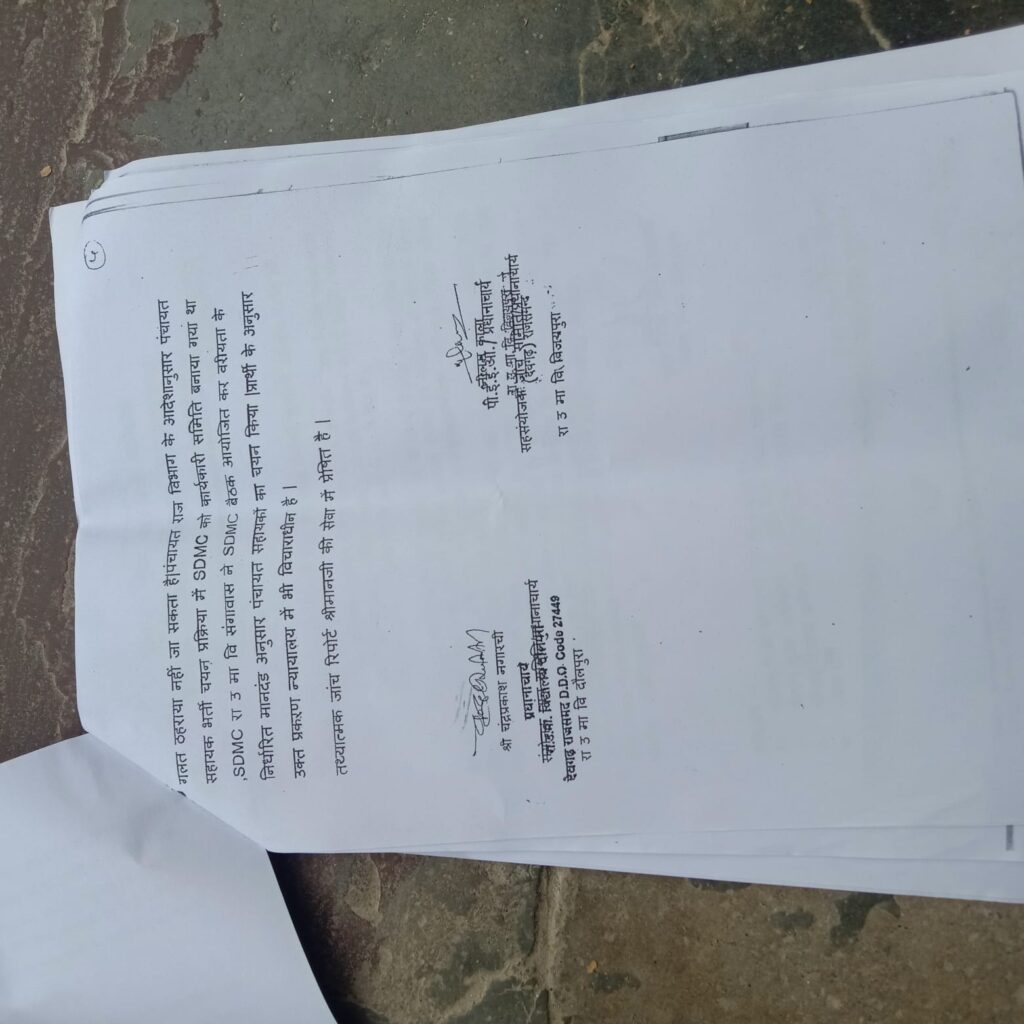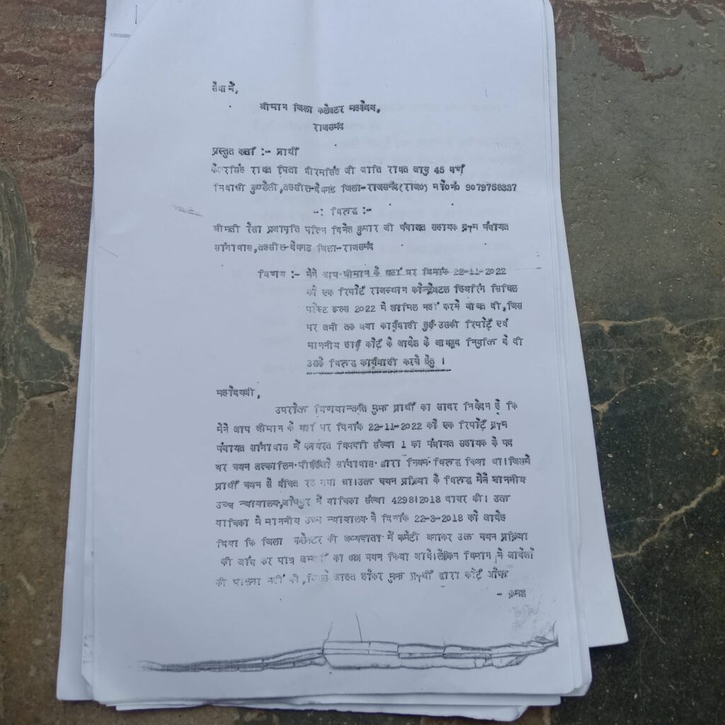 पंचायत सहायक भर्ती 2017 में ब्लॉक देवगढ़ के PEEO राजकीय उच्च माध्यमिक विद्यालय सांगावास( देवगढ़ )में पंचायत सहायक भर्ती में PEEOएवं अध्यापकों द्वारा अनुभव के गलत अंक देकर वरीयता सूची को प्रभावित किया ,गया जिसकी रिपोर्ट परिवादी केसर सिंह S/oवीरम सिंह निवासी कुंडेली द्वारा दी गई परंतु आज दिनांक तक राहत नहीं मिली परिवादी द्वारा राजस्थान उच्च न्यायालय के आदेश के अनुसार भी जांच नहीं कर गलत तथ्य पेश किया गया एवं जिला कलेक्टर राजस्थान द्वारा 2022 जांच के आदेश दिया परंतु जांच अधिकारी PEEदोलपुररा एवं PEEO विजयपुरा द्वारा की गई परंतु उसे जांच में भी तथ्य उजागर किए परंतु उन तथ्यों को तत्कालीन PEEOद्वारा मौखिक वार्ता से उनको अंकों की गलत ढंग से पेश किया गया ! इसको अभी तक जांच नहीं की गई इसका प्रार्थना पत्र 15 5 2025 को कलेक्टर महोदय को दिया परंतु आज दिन तक किसी प्रकार की कार्यवाही नहीं हुई न हीं किसी प्रकार की राहत मिली प्रार्थी को कब तक मिलेगी राहत ।