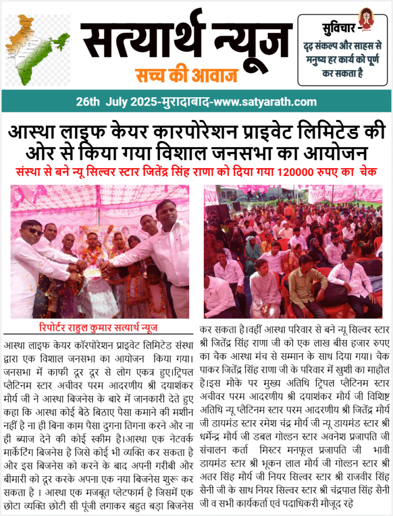 आस्था लाइफ केयर कॉरपोरेशन प्राइवेट लिमिटेड संस्था द्वारा एक विशाल जनसभा का आयोजन किया गया।जनसभा में काफी दूर दूर से लोग एकत्र हुए।ट्रिपल प्लैटिनम स्टार अचीवर परम आदरणीय श्री दयाशंकर मौर्य जी ने आस्था बिजनेस के बारे में जानकारी देते हुए कहा कि आस्था कोई बैठे बिठाए पैसा कमाने की मशीन नहीं है ना ही बिना काम पैसा दुगना तिगना करने और ना ही ब्याज देने की कोई स्कीम है।आस्था एक नेटवर्क मार्केटिंग बिजनेस है जिसे कोई भी व्यक्ति कर सकता है और इस बिजनेस को करने के बाद अपनी गरीबी और बीमारी को दूर करके अपना एक नया बिजनेस शुरू कर सकता है । आस्था एक मजबूत प्लेटफार्म है जिसमें एक छोटा व्यक्ति छोटी सी पूंजी लगाकर बहुत बड़ा बिजनेस कर सकता है।