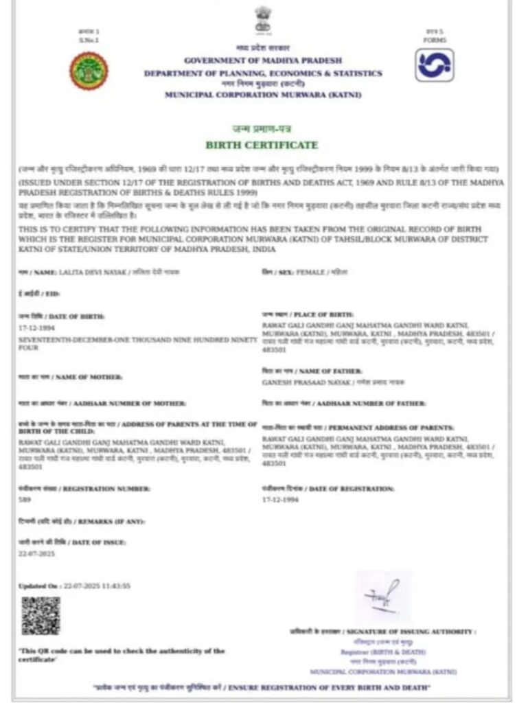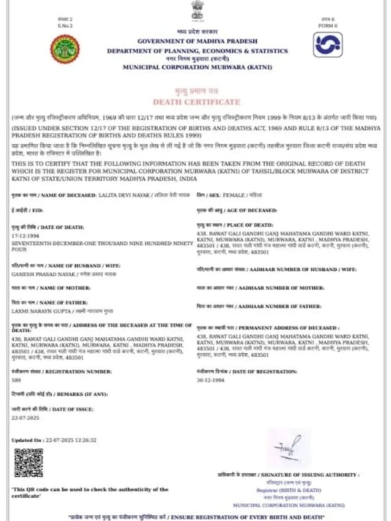 कटनी, 27 जुलाई 2025: नगर निगम कटनी के कार्यप्रणाली में एक सनसनीखेज मामला सामने आया है, जो प्रशासनिक पारदर्शिता और कार्यकुशलता पर गंभीर सवाल खड़े करता है। एक महिला की समग्र आईडी बनने के कुछ समय बाद ही उसका जन्म प्रमाणपत्र जारी किया गया, और हैरतअंगेज रूप से मात्र 43 मिनट बाद उसी महिला का मृत्यु प्रमाणपत्र (पंजीकरण नंबर 589) जारी कर दिया गया। यह घटना नगर निगम की प्रणाली में गहरी खामियों और लापरवाही को उजागर करती है।