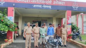 पुलिस अधीक्षक सोनभद्र श्री अशोक कुमार मीणा द्वारा चोरी की घटनाओं पर अंकुश लगाने हेतु चलाये जा रहे अभियान के क्रम में अपर पुलिस अधीक्षक मुख्यालय श्री अनिल कुमार के निर्देशन व क्षेत्राधिकारी ओबरा श्री हर्ष पाण्डेय के निकट पर्यवेक्षण व प्रभारी निरीक्षक ओबरा श्री राजेश कुमार सिंह के कुशल नेतृत्व में आज दिनांक 05.08.2025 को थाना ओबरा पुलिस द्वारा थाना स्थानीय पर पंजीकृत मु0अ0सं0 174/25 धारा 303(2) बीएनएस से सम्बन्धित से 03 नफर अभियुक्तगण 1-दीपनारायण बैगा उर्फ दीपू पुत्र शम्भू बैगा निवासी पनारी टोला कडिया थाना ओबरा जनपद सोनभद्र, 2- दयाशंकर बैगा उर्फ दयाराम पुत्र रामप्रसाद निवासी निवासी कडिया थाना ओबरा जनपद सोनभद्र, 3- कन्हई उर्फ कन्हैया पुत्र सीता राम बैगा निवासी कड़िया थाना ओबरा जनपद सोनभद्र को मुखबिर की सूचना पर रेणु नदी पुल पर से गिरफ्तार कर तलाशी ली गयी तो उनके कब्जे से एक अदद चोरी की मोटरसाईकिल वाहन संख्या UP64AH 7120 हीरो सुपर स्पलेन्डर तथा अभियुक्त दीपनारायण बैगा उर्फ दीपू पुत्र शम्भू बैगा निवासी पनारी टोला कडिया थाना ओबरा जनपद सोनभद्र के कब्जे से 01 किलो 100 ग्राम नाजायज गांजा बरामद किया गया, जिसके सम्बन्ध में थाना ओबरा पर अभियुक्त दीपनरायण बैगा उर्फ दीपू के विरुद्ध मु0अ0सं0- 175/2025 धारा 8/20 एनडीपीएस एक्ट पंजीकृत किया गया। गिरफ्तारशुदा अभियुक्त *दयाराम उर्फ दयाशंकर बैगा जनपद के कई थानों से वांछित चल रहा था, जिसकी गिरफ्तारी हेतु पुलिस अधीक्षक महोदय द्वारा पूर्व में 25000 रुपये पुरस्कार की घोषणा की गयी थी।* गिरफ्तारशुदा अभियुक्तगण को मा0 न्यायालय रवाना किया ।