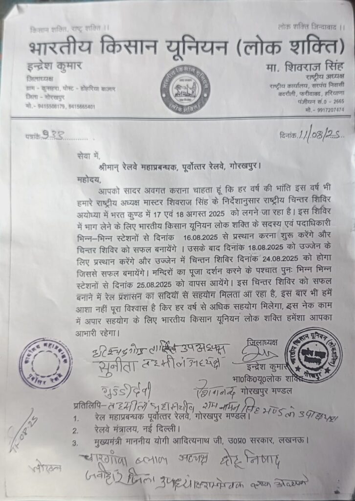 जिसमें रेलवे प्रशासन जिला अधिकारी को ज्ञापन के माध्यम से यह बताया गया कि अयोध्या में भारतीय किसान यूनियन लोक शक्ति के राष्ट्रीय अध्यक्ष मास्टर शिवराज सिंह द्वारा राष्ट्रीय चिंतन शिविर का आयोजन 17,18 तारीख को किया जा रहा है जिसमें सभी किसान भाई लोग उपस्थित होंगे