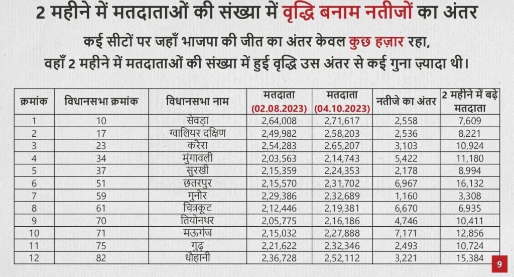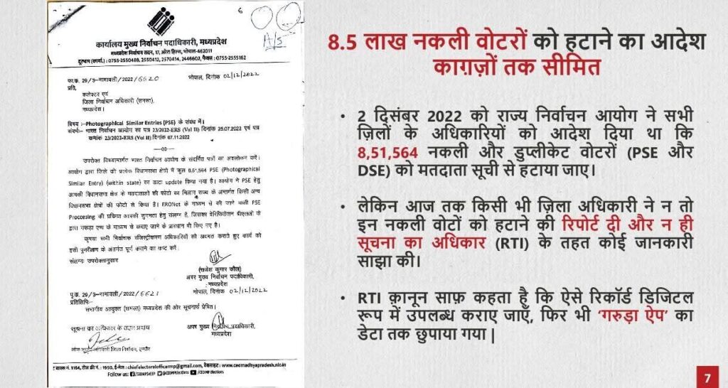 2023 के मध्य प्रदेश विधानसभा चुनावों में भाजपा ने 163 सीटें जीतकर सत्ता बरकरार रखी, जबकि कांग्रेस को महज 66 सीटों से संतोष करना पड़ा। कांग्रेस का दावा है कि कई सीटों पर अनियमितताएं हुईं, खासकर उन 27 सीटों पर जहां पार्टी मामूली अंतर से हारी। सिंघार ने कहा कि मतदाता सूची में अचानक नाम जोड़ने की प्रक्रिया पारदर्शी नहीं थी और चुनाव आयोग ने इसकी कोई सार्वजनिक जानकारी नहीं दी। “मतदाता सूची लोकतंत्र की रीढ़ है, लेकिन आयोग इसे साझा करने से इनकार क्यों कर रहा है?” उन्होंने पूछा। कांग्रेस ने इस मुद्दे पर राजनीतिक मामलों की समिति की बैठक भी बुलाई और ‘वोट चोरी’ के खिलाफ राज्यव्यापी जागरूकता अभियान शुरू करने की घोषणा की है, जिसमें रैलियां और जनसंपर्क शामिल होंगे।