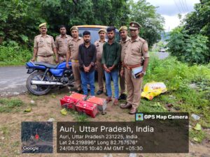 *प्रकरण-* दिनांक 21/22 अगस्त 2025 की रात्रि में के0के0 अस्पताल ओड़ी, थाना अनपरा के सामने खड़े एक ट्रेलर एवं एक हाईवा वाहन से अज्ञात चोरों द्वारा कुल चार बड़ी बैटरियों की चोरी की गई थी। इस संबंध में वाहन स्वामी श्री भोला सिंह (निवासी-आदर्शनगर, थाना अनपरा) द्वारा थाना अनपरा में तहरीर दी गई, जिस पर तत्काल थाना स्थानीय पर मु0अ0सं0-134/25 धारा 303(2), 317(2) बीएनएस का अभियोग पंजीकृत कर विवेचना प्रारंभ की गई। विवेचक द्वारा सुरागरसानी करते हुए मुखबिर की सहायता से अपराधियों की तलाश की गई। दिनांक 24 अगस्त 2025 को मुखबिर की सटीक सूचना पर थाना अनपरा पुलिस टीम द्वारा कुबरी पहाड़ी काली माता मंदिर के पास से दो अभियुक्तों 01.उत्कर्ष कनौजिया पुत्र कृष्णा कनौजिया, 02. करण यादव पुत्र स्वर्गीय रमेश यादव निवासीगण-वार्ड संख्या 6, सुभाष नगर, थाना अनपरा, जनपद सोनभद्र को एक मोटरसाइकिल पर दो चोरी की बैटरियों के साथ गिरफ्तार किया गया।