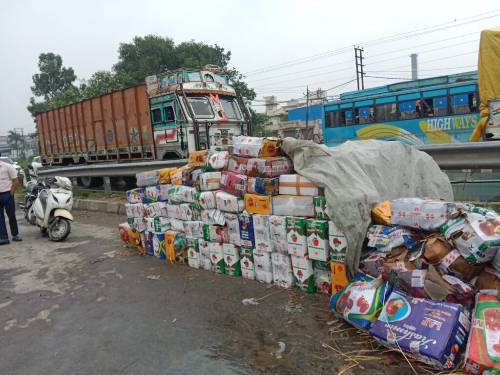 लुधियाना के शेरपुर चौक पर सेब से भरा ट्रक पलट गया।