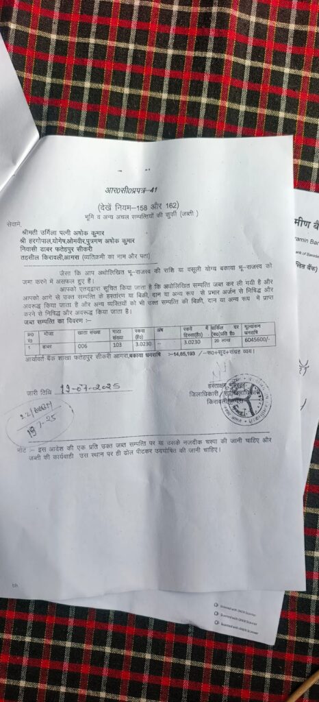 फतेहपुर सीकरी । उपजिला अधिकारी किरावली के निर्देशानुसार कस्बा की संतोष नगर स्थिति आर्यावर्त बैंक शाखा ने बैंक में अधोलिखित भू राजस्व की राशि को जमा करने में असफल हुए किसानों के खिलाफ कुर्की आदेश जारी किए हैं ,