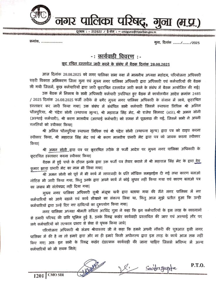 नगर पालिका परिषद गुना में बड़ा मामला सामने आया है। परिषद के कुछ कर्मचारियों ने मुख्य नगर पालिका अधिकारी (सीएमओ) के फर्जी हस्ताक्षर कर कूटरचित आदेश जारी कर दिया। जब यह मामला उजागर हुआ तो 28 अगस्त को नगर पालिका सभा कक्ष में आपात बैठक बुलाई गई।