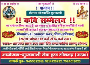 रामगढ़ (सोनभद्र)। गुप्तकाशी सेवा ट्रस्ट के तत्वावधान में रविवार को उदय प्रताप सिंह इंटरमीडिएट कॉलेज, रामगढ़ में “पंचतत्व को समर्पित कवि सम्मेलन” का आयोजन दोपहर दो बजे से प्रकृति,पर्यावरण संरक्षण के नायक ट्रस्ट के संस्थापक रवि प्रकाश चौबे के नेतृत्व में किया जायेगा।