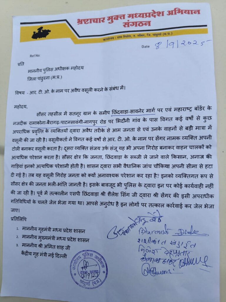 पांढुर्ना- भ्रष्टाचार मुक्त मध्यप्रदेश अभियान संगठन* ने जिले में आर.टी.ओ. के नाम पर की जा रही अवैध वसूली को लेकर जिला पुलिस अधीक्षक को ज्ञापन सौंपा है। संगठन ने आरोप लगाया कि सावनेर मार्ग पर स्थित ग्राम सातनूर से लेकर छिंदवाड़ा-सावनेर मार्ग और महाराष्ट्र बॉर्डर तक कई वर्षों से कुछ तत्वों द्वारा ग्रामीणों, किसानों और व्यापारियों से जबरन वसूली की जा रही है।