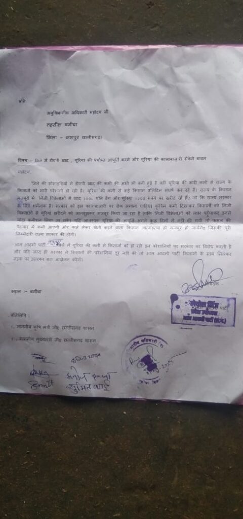 जशपुर के बगीचा, सन्ना, क्षेत्र डीएपी खाद यूरिया की पर्याप्त आपूर्ति करने और कालाबाजारी को रोकने आम आदमी पार्टी ने की मांग सौपा ज्ञापनअनुविभागीय अधिकारी बगीचा जिला जशपुर छत्तीसगढ़