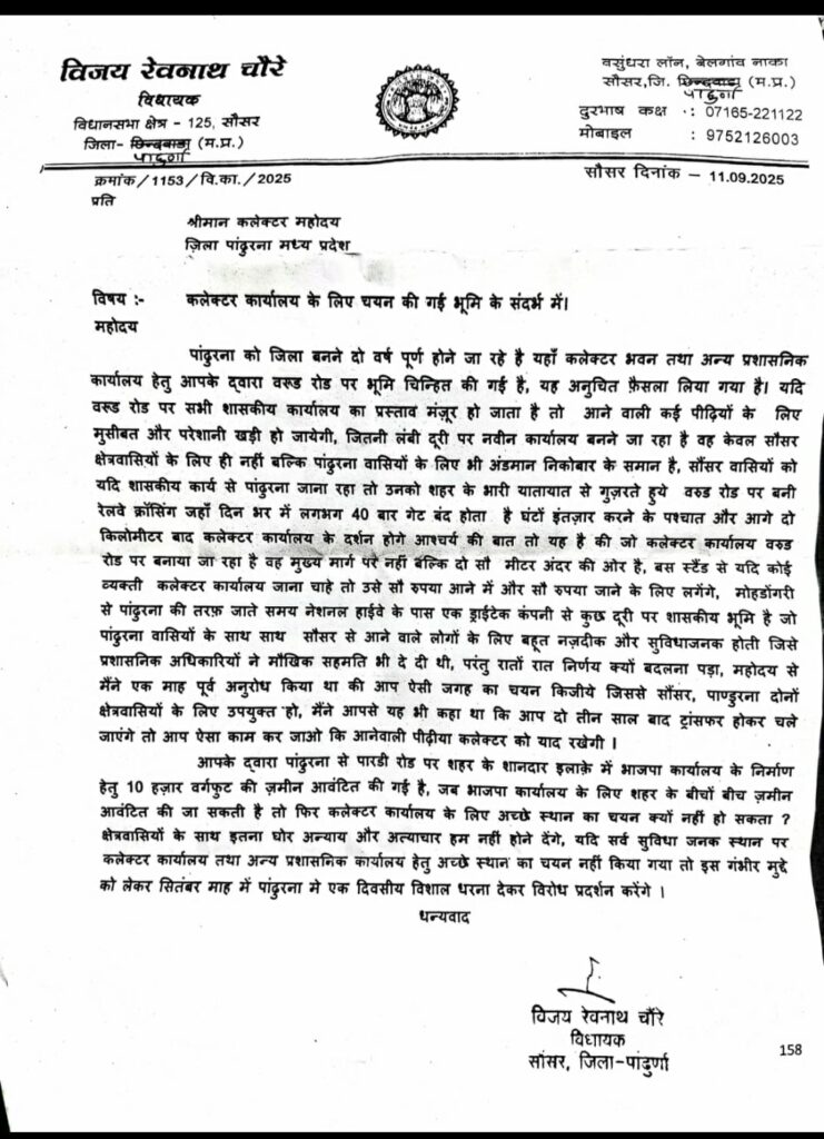 पांढुरना – कांग्रेस विधायक विजय चौरे ने जिला कांग्रेस अध्यक्ष एवं अन्य नेतागणों के साथ जिला कलेक्टर अजयदेव शर्मा को ज्ञापन सौंपकर कलेक्टर भवन के निर्माण के लिए वरुड रोड पर भूमि चिन्हित करने के फैसले पर पुनर्विचार करने की मांग की है। उनका तर्क है कि वरुड रोड पर स्थित रेलवे क्रॉसिंग के कारण लोगों को घंटों इंतजार करना पड़ सकता है, जिससे क्षेत्रवासियों को परेशानी होगी।