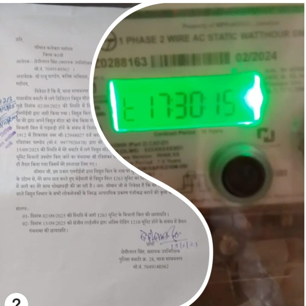 कटनी, 20 सितंबर 2025: माधवनगर थाना परिसर में रहने वाले सहायक उपनिरीक्षक छेदीलाल सिंह ने मध्य प्रदेश विद्युत मंडल (MPEB) पर धोखाधड़ी का गंभीर आरोप लगाया है। उन्होंने जिला कलेक्टर को संबोधित एक पत्र में कहा है कि विद्युत विभाग ने उनके बिजली बिल में गलत रीडिंग दर्शाकर अतिरिक्त राशि वसूलने का प्रयास किया।