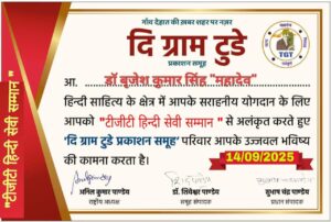 सोनभद्र। हिन्दी दिवस के अवसर पर ग्राम टुडे प्रकाशन समूह मुम्बई महाराष्ट्र द्वारा डॉ बृजेश महादेव शिक्षक एवं साहित्यकार बेसिक शिक्षा परिषद सोनभद्र को हिन्दी साहित्य के क्षेत्र में सराहनीय योगदान के लिए “टीजीटी हिन्दी सेवी सम्मान” से अलंकृत किया गया। यह सम्मान ग्राम टुडे प्रकाशन समूह मुम्बई के अनिल कुमार पाण्डेय राष्ट्रीय अध्यक्ष, सुभाष चंद्र पाण्डेय प्रधान संपादक व डॉ. शिवेश्वर पाण्डेय समूह संपादक द्वारा प्रदान किया गया।