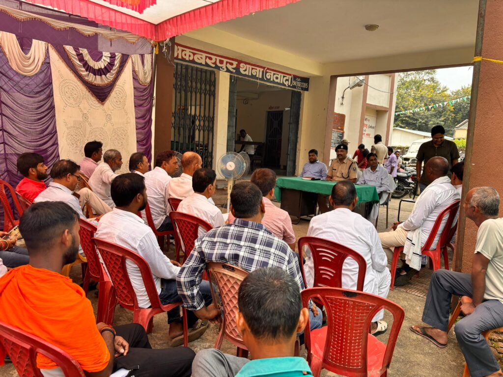 अकबरपुर( नवादा ) अकबरपुर थाना परिसर में आगामी दुर्गा पूजा को लेकर शांति समिति की बैठक प्रखंड विकास पदाधिकारी नीतीश कुमार राणा एवं अंचल अधिकारी संजय कुमार प्रसाद की संयुक्त अध्यक्षता में तथा थाना अध्यक्ष रूपेश कुमार सिंहा के संचालन में संपन्न हुआ