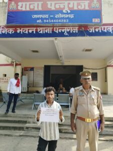 पुलिस अधीक्षक सोनभद्र श्री अभिषेक वर्मा के कुशल निर्देशन एवं अपर पुलिस अधीक्षक (आप0) तथा क्षेत्राधिकारी सदर के मार्गदर्शन में मिशन शक्ति फेज-5 के तहत महिला सुरक्षा हेतु चलाए जा रहे अभियान के क्रम में थाना पन्नूगंज पुलिस द्वारा एक सराहनीय कार्यवाही की गई। थाना पन्नूगंज पुलिस टीम ने कलाम पुत्र इब्राहिम, निवासी ग्राम रागमढ़, थाना पन्नूगंज, जनपद सोनभद्र को उस समय गिरफ्तार किया जब वह ब्लाक रोड कस्बा रामगढ़ में आने-जाने वाली महिलाओं व बालिकाओं कों देखकर छिटाकशी करते हुए अश्लील गाना गा रहा था महिला सम्मान के विरुद्ध इस प्रकार की हरकत को गम्भीरता से लेते हुए अभियुक्त के विरुद्ध थाना पन्नूगंज पर मु0अ0सं0 179/2025 धारा 296 बीएनएस के तहत अभियोग पंजीकृत कर आवश्यक विधिक कार्यवाही की गई है।