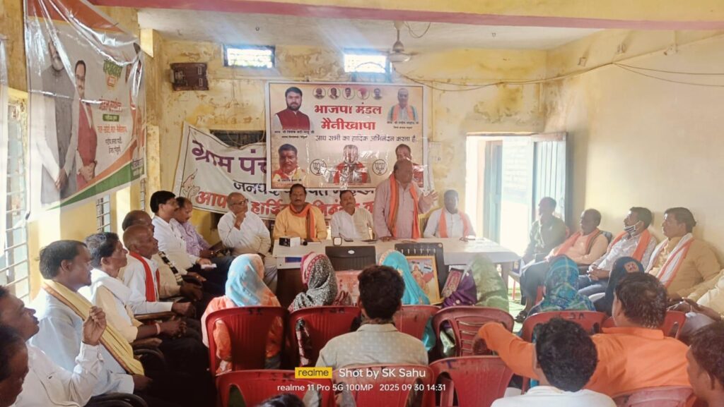 मैनीखापा मंडल की कार्यशाला का आयोजन हीरावाड़ी में किया गया जिसमें भाजपा मंडल अध्यक्ष धर्मराज कुमरे, वरिष्ठ मोरेश्वर मर्सकोले, मदन साहू, पूर्व मंडल अध्यक्ष महामंत्री महेश शीलू, दीनदयाल साहू, अमरलाल साहू और अन्य कार्यकर्ता उपस्थित हुए। इस कार्यशाला में आत्म निर्भर भारत संकल्प के तहत जीएसटी बचत उत्सव और स्वदेशी अपनाओ-देश बढ़ाओ अभियान पर चर्चा की गई।