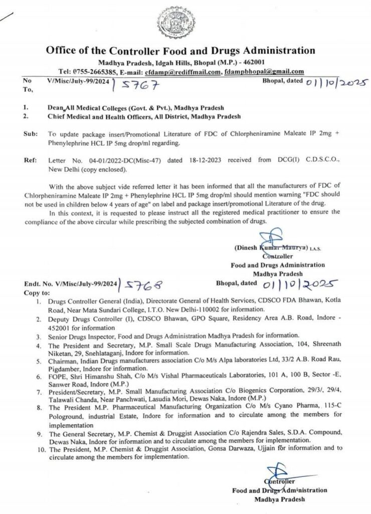 खाद्य एवं औषधि प्रशासन विभाग के नियंत्रक श्री दिनेश कुमार मौर्य ने समस्त औषधि निर्माताओं, औषधि निरीक्षकों, मुख्य चिकित्सा एवं स्वास्थ्य अधिकारियों तथा मेडिकल कॉलेजों के डीन को 1 अक्टूबर 2025 को क्लोर फ़ेनिरामाइन मेलिएट एवं फ़ेनाइलफ़्रिन एचसीएल के उपयोग के संबंध में एडवाइजरी जारी की गई है। जिसमें क्लोरफेनिरामीन मेलिएट IP 2mg + फिनाईलफ्रिन HCL IP 5mg ड्रॉप/मि.ली. के संयोजन (एफ.डी.सी.) का निर्माण करने वाली सभी कम्पनियों को अपने औषधि के लेबल, पैकेज इंसर्ट एवं प्रचार साहित्य पर यह चेतावनी स्पष्ट उल्लेखित होनी चाहिए की -“यह एफ.डी.सी. 4 वर्ष से कम आयु के बच्चों में उपयोग नहीं किया जाना चाहिए।