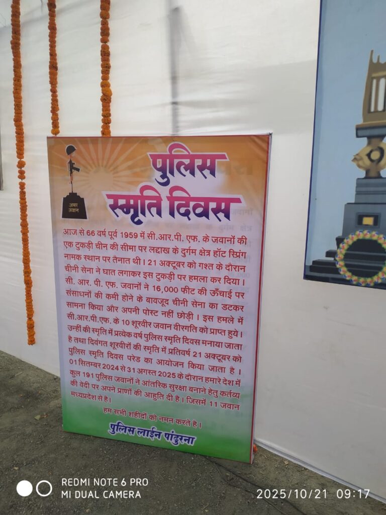 पुलिस लाइन पांढुरना में पुलिस स्मृति दिवस के अवसर पर श्रद्धांजलि समारोह का आयोजन किया गया। जिला पुलिस अधीक्षक श्री सुंदर सिंह कनेश द्वारा शहीद 191 जवानों का नाम वाचन कर पुष्प चक्र अर्पित कर श्रद्धांजलि अर्पित की। इस अवसर पर इस दौरान चीन सीमा पर शहीद हुए दस वीर पुलिसकर्मियों सहित वर्ष 2024–25 में देशभर के 191 शहीद जवानों को नमन किया गया।समारोह में पुलिस अधीक्षक सुन्दर सिंह कनेश ने शहीदों के प्रति श्रद्धा व्यक्त करते हुए कहा कि कर्तव्यनिष्ठा के पथ पर अपने प्राणों की आहुति देने वाले वीर अमर शहीदों को शत-शत नमन। पुलिस बल की वीरता और समर्पण की भावना समाज में सुरक्षा और विश्वास की आधारशिला है।