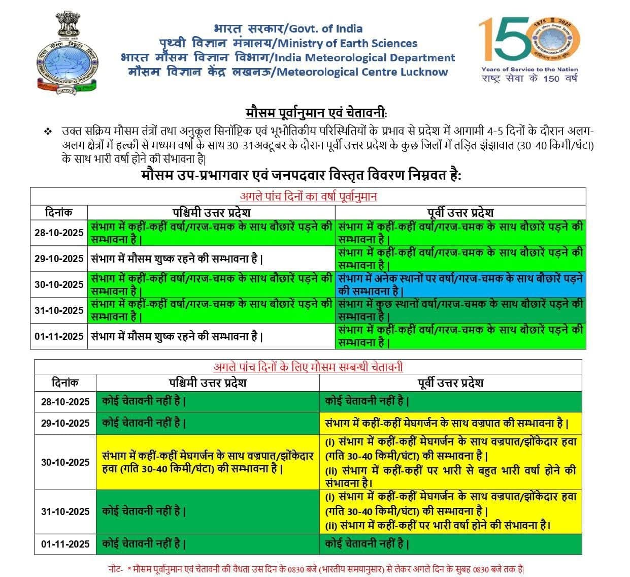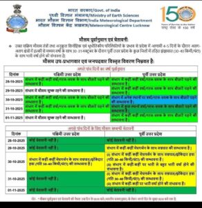 बंगाल की खाड़ी में बना गंभीर चक्रवाती तूफान “मोंथा” अब आंध्रप्रदेश तट से टकरा गया है। मौसम विभाग के अनुसार, लैंडफॉल की प्रक्रिया जारी है और अगले 3-4 घंटे तक जारी रहने की संभावना है। इसके बाद यह तूफान उत्तर-उत्तर पश्चिमी दिशा में आगे बढ़ते हुए धीरे-धीरे कमजोर पड़ जाएगा।हालांकि, इसके अवशेष का असर 29 से 31 अक्टूबर के बीच उत्तर प्रदेश के दक्षिणी और पूर्वी हिस्सों में देखने को मिलेगा। इस दौरान कई जिलों में झोंकेदार हवाओं के साथ हल्की से मध्यम वर्षा, जबकि 30-31 अक्टूबर को पूर्वांचल के कुछ जिलों में भारी वर्षा और मिर्जापुर एवं वाराणसी मंडल में बहुत भारी बारिश की संभावना जताई गई है।इसी बीच, अरब सागर पर बने अवदाब और मध्य गुजरात से होते हुए राजस्थान तक फैली द्रोणी के प्रभाव से पूरे प्रदेश में मौसम में बड़ा बदलाव देखने को मिल रहा है। निचले एवं मध्य क्षोभमंडल में आ रही नमी और ऊपरी क्षोभ मंडल में सक्रिय जेटस्ट्रीम के चलते प्रदेश भर में बादल छाए रहे और कई जगह अक्टूबर का सबसे ठंडा दिन दर्ज हुआ — विशेष रूप से आगरा और इटावा में यह रिकॉर्ड टूटा।
